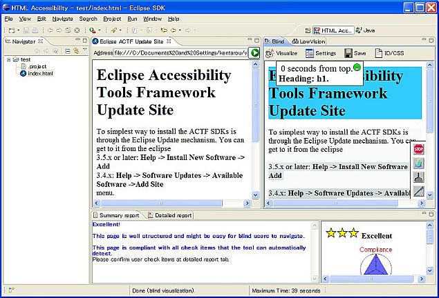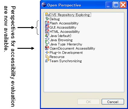 Major features of visualization part, such as blind usability visualization, low-vision simulation, Flash content inspection function, etc., can be used in Eclipse IDE by selecting each accessibility perspective (Flash Accessibility, GUI Accessibility, HTML Accessibility and ODF Accessibility).