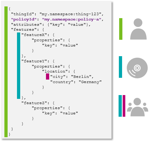 | thing:/features/X/properties/Y | Applies to the property with path Y (and its sub-paths) of the Feature with ID X. Y may be a nested path such as tire/pressure. |