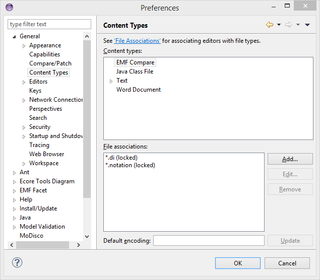 Q: I want my models to be compared as text but I can't remove its association to XMI Content Type or EMF Compare content type because they are locked (e.g. Ecore, UML, etc…)