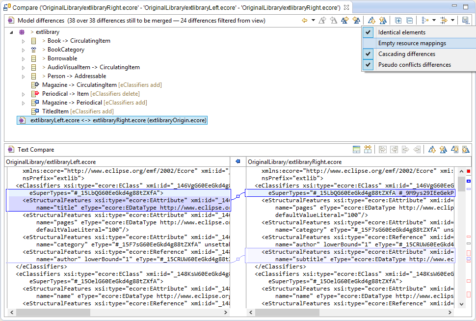 A: Every files locked with XMI content type (i.e. their content type is "org.eclipse.emf.ecore.xmi" or one of its subtype) or EMF Compare content type can not be forced to use the text compare editor. This is a Eclipse Compare platform limitation. You can, however, see the text comparison from the EMF Compare editor. Deactivate the "Empty Resource Mappings" filter and then select the appropriate resource mapping. The bottom panes will display the comparison of the textual content of the mapped resources.