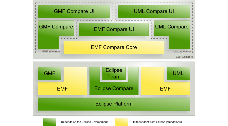 EMF Compare is built on top of the Eclipse platform. We depend on the Eclipse Modeling Framework (EMF), the Eclipse Compare framework and, finally, Eclipse Team, the framework upon which the repository providers (EGit, CVS, Subversive...) are built.