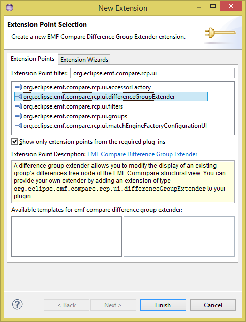 EMF Compare can be customized in a number of ways, the most important of which were described above. Most of them re-use the same entry point, the org.eclipse.emf.compare.EMFCompare class. We won't customize much here, please see the aforementioned section for extensibility means.