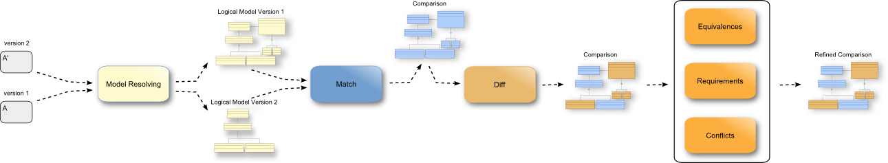 EMF Compare uses a single model, whose root is a Comparison object, to represent all of the information regarding the comparison: matched objects, matched resources, detected differences, links between these references, etc. The root Comparison is created at the beginning of the Match process, and will undergo a set of successive refinements during the remainder of the Comparison: Diff, Equivalence, Dependencies... will all add their own information to the Comparison.