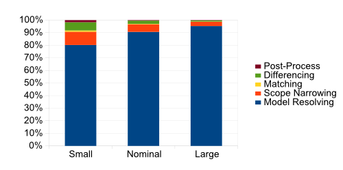 As shown with the above graphs, the most important remaining time sink is the resolution of the logical model. This is partly due to the I/O operations performed during this phase, but first and foremost it is due to the parsing of the XMI representation of the files we used (UML fragments) as EMF models. EMF Compare needs to actually load all fragments of the logical model as EMF model fragments in order to determine their cross-resource references, which represent other parts of the logical model that will need in turn. This phase could be improved by parsing the raw XMI data to find all of these cross-resource references without parsing the actual EMF elements of which they are a part.