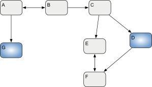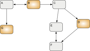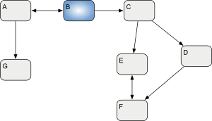 Each of the three sides is an EMF model composed of 7 fragments. Origin is the common ancestor of left and right. The blue-colored fragments are those that actually present differences (so D and G have been modified in the "left" copy while only B has been modified in the "right" copy).