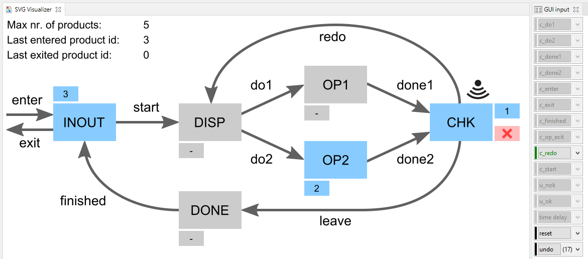 At the top left some additional information is provided. It indicates the maximum number of products that may be in the system, as configured via MAX_NR_OF_PRODS. It further indicates the product id of the last product that entered the system, or n/a if no product has entered the system yet. Finally, it indicates the product id of the last product that existed, as indicated by INOUT.lastExitId, or n/a if no product has exited thus far.