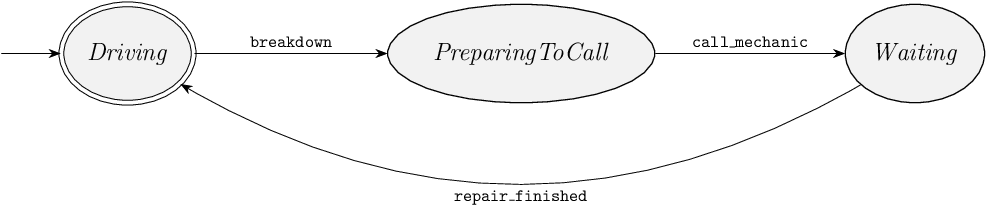 Once the repairs have been completed (event repair_finished), and the car is again in working order, the driver can continue driving it (location Driving).