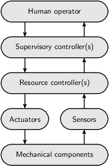 At the bottom are the mechanical components, such as motors, switches, levers and valves. Their operation can be steered through actuators and their state of operation and changes therein can be observed through sensors. Resource controllers provide a first level of control. They may for instance correct for sensor jitter, translate continuous signals to discrete ones, or detect and even correct anomalous situations.