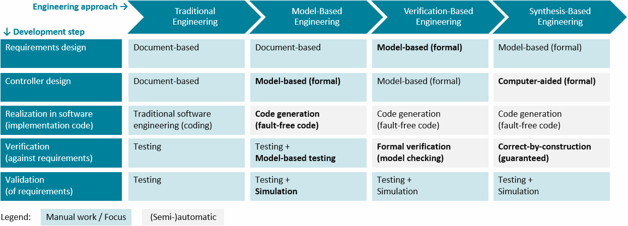 The columns indicate various engineering approaches. From left to right, they employ progressively more automation and computer assistance. The rows of the table indicate typical steps involved in the development of supervisory controllers. The cells indicate for each approach what is involved in the particular step. The green-colored cells indicate that the step involves mostly, or at least significant, manual work for the particular engineering approach. Contrarily, the gray-colored cells indicate that the step is (mostly) automated for that approach. As the steps with more manual work generally require the most engineering effort, the green cells also indicate where the engineering focus is for a particular approach. Bold texts in cells indicate changes compared to the previous column.