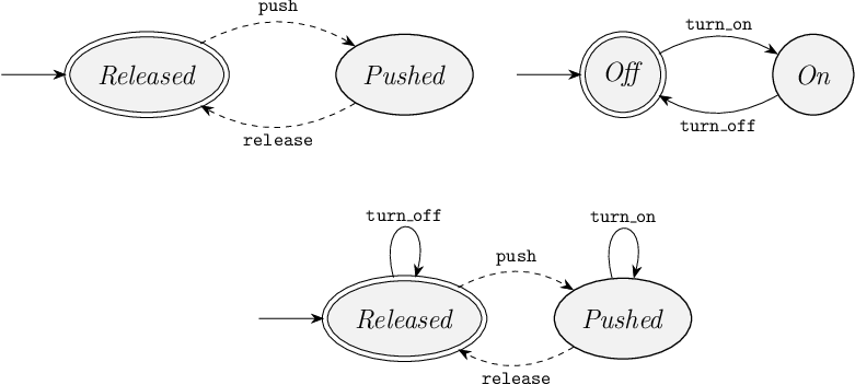 Through synchronization, all three automata together model the correct operation of the system. For instance, without the bottom automaton, the motor can be turned on and off at any time, without any relation to the button. And even though the top-right automaton allows a motor to be turned on repeatedly, the bottom automaton indicates this is not possible, as a motor can only alternatingly be turned on and off. The behavior of the top-left automaton is contained in the behavior of the bottom automaton, and could be removed without changing the behavior of this system. We will see later in the course why it is still good to model each part of a system separately, and only then restrict their combined behavior.