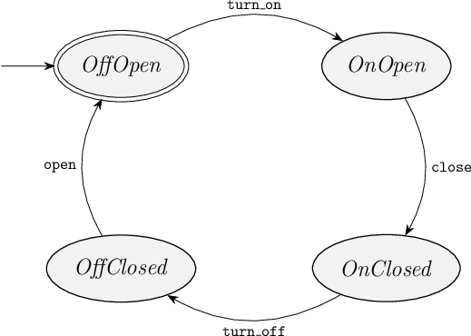 To deal with a requirement automaton during synthesis, it is first converted to a plant automaton and some state/event exclusion requirements. That is, the requirement automata is rebranded as a plant automaton. And all restrictions are moved to state/event exclusion requirements. The rebranded requirement then by itself is a non-restrictive plant automaton, that does not prevent any behavior. As an example, consider again the railway crossing example from earlier in this module, with the following state space: