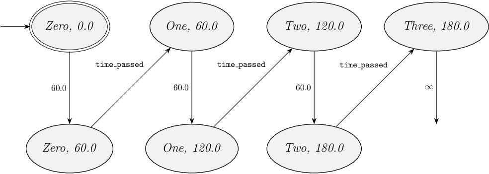The time_passed event then becomes enabled in state (Zero, 60.0), and by an event transition for this event we get to the (One, 60.0) state.