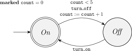 If the On location is the current location, and count has reached value 5, then the guard of the edge with event turn_on is not satisfied.