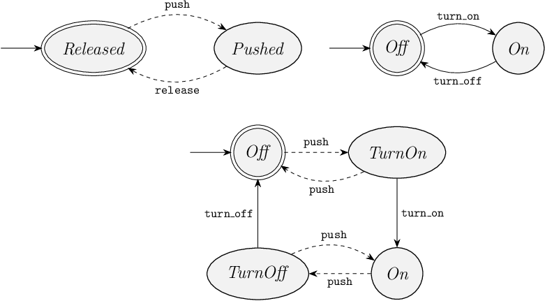 Through synchronization, all three automata together model the correct operation of the system. For instance, without the bottom automaton, the motor can be turned on and off at any time, without any relation to the button. And even though the top-right automaton allows a motor to be turned on repeatedly, the bottom automaton indicates this is not possible, as a motor can only alternatingly be turned on and off. The behavior of the top-left automaton is contained in the behavior of the bottom automaton, and could be removed without changing the behavior of this system. We will see later in the course why it is still good to model each part of a system separately, and only then restrict their combined behavior.