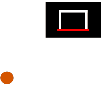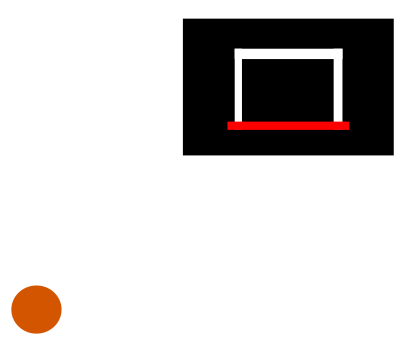 Consider a basketball (shown as a brown circle) being thrown at a backboard (shown as a large rectangle), bouncing off that backboard, and going through the hoop (also known as the ring, shown as a red line):
