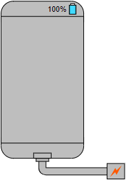 The rectangle with rounded borders represents the phone. At its top right is the battery indicator, both as a light-blue bar and as a text. At the bottom is its power connector. The power connector is connected to the charging cable. The charging cable is connected to the charger, the bottom-right box with the charging icon.