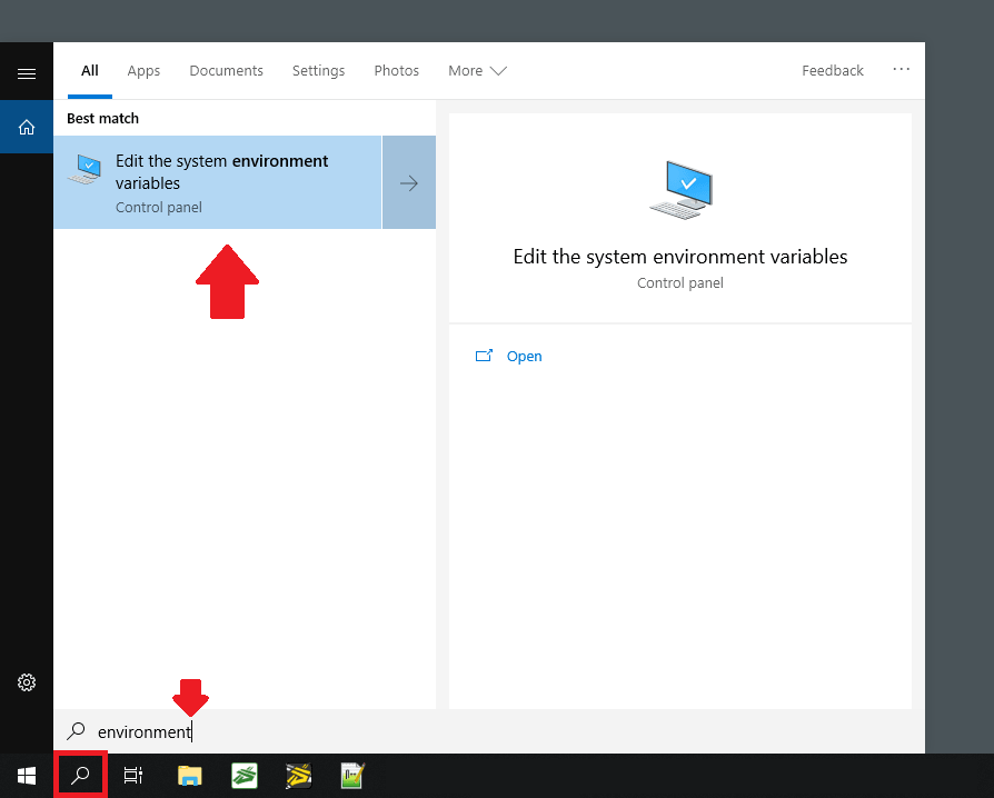 - On the Windows search box (on the Taskbar) search for environment. The best match result should be the "Edit the system environment variables" option. Open it.