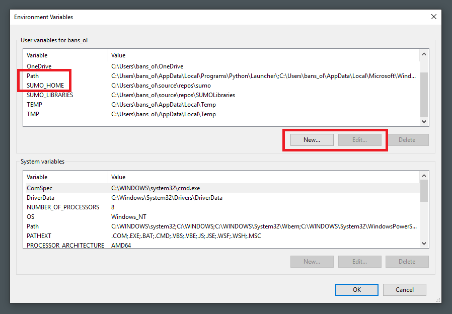 ;C:\Program Files\sumo-1.26.0\binto the end of the PATH value (don't delete the existing values!) - Under user variables now select SUMO_HOME and click Edit. If no such variable exists you must create it with the New-Button