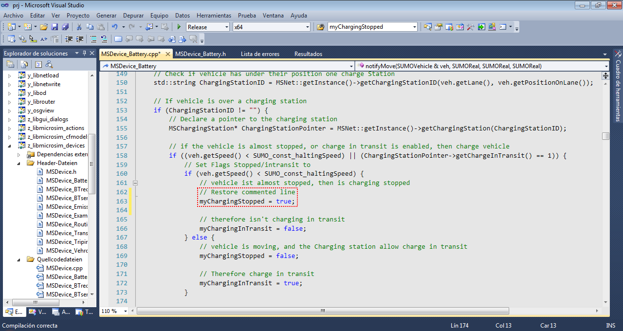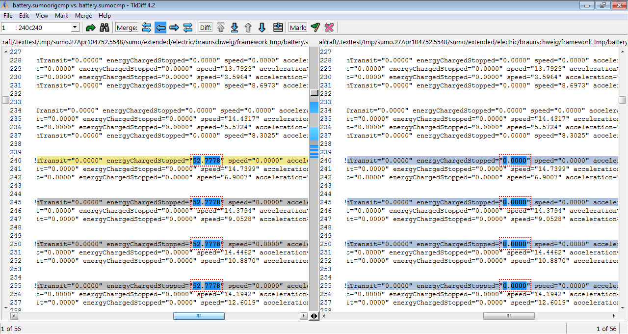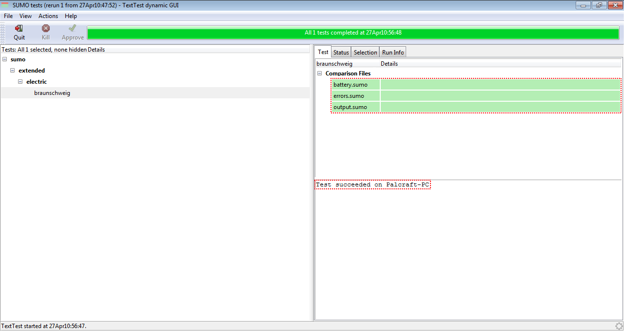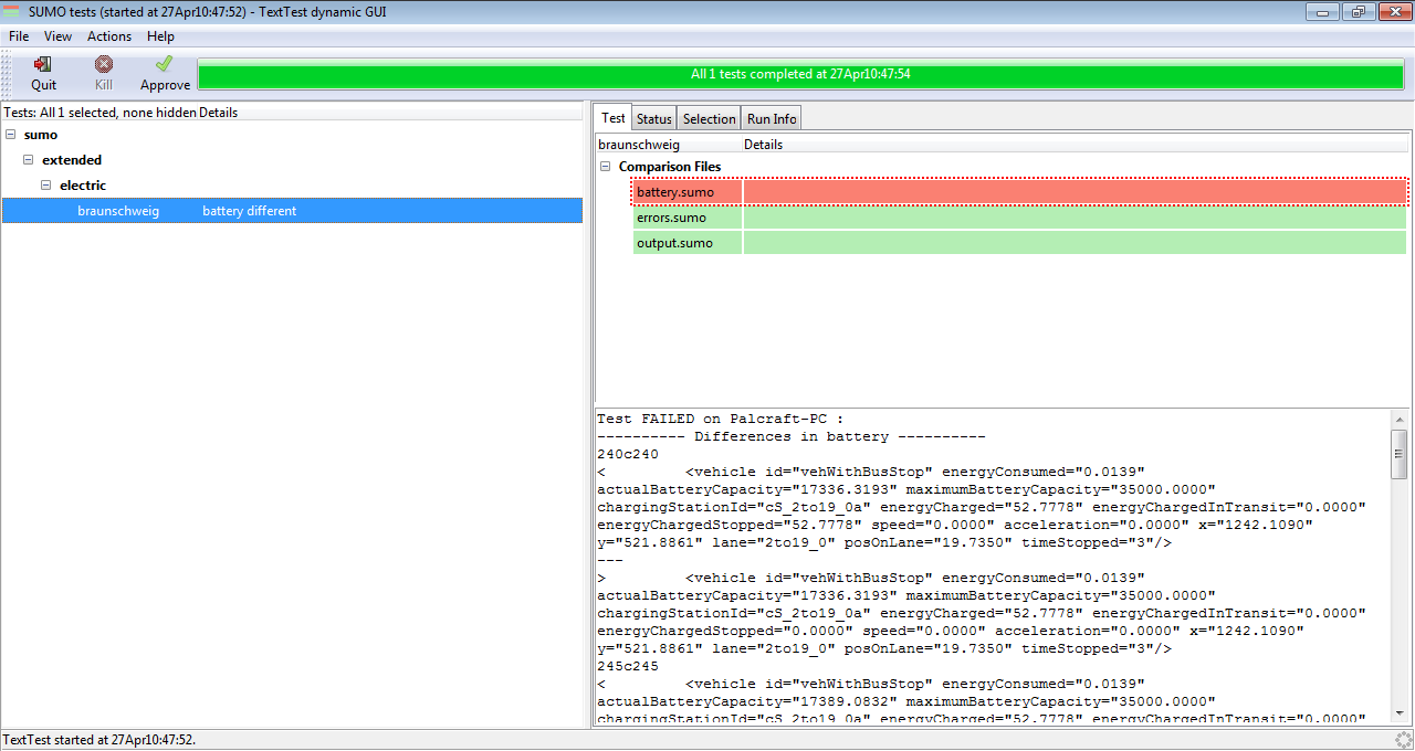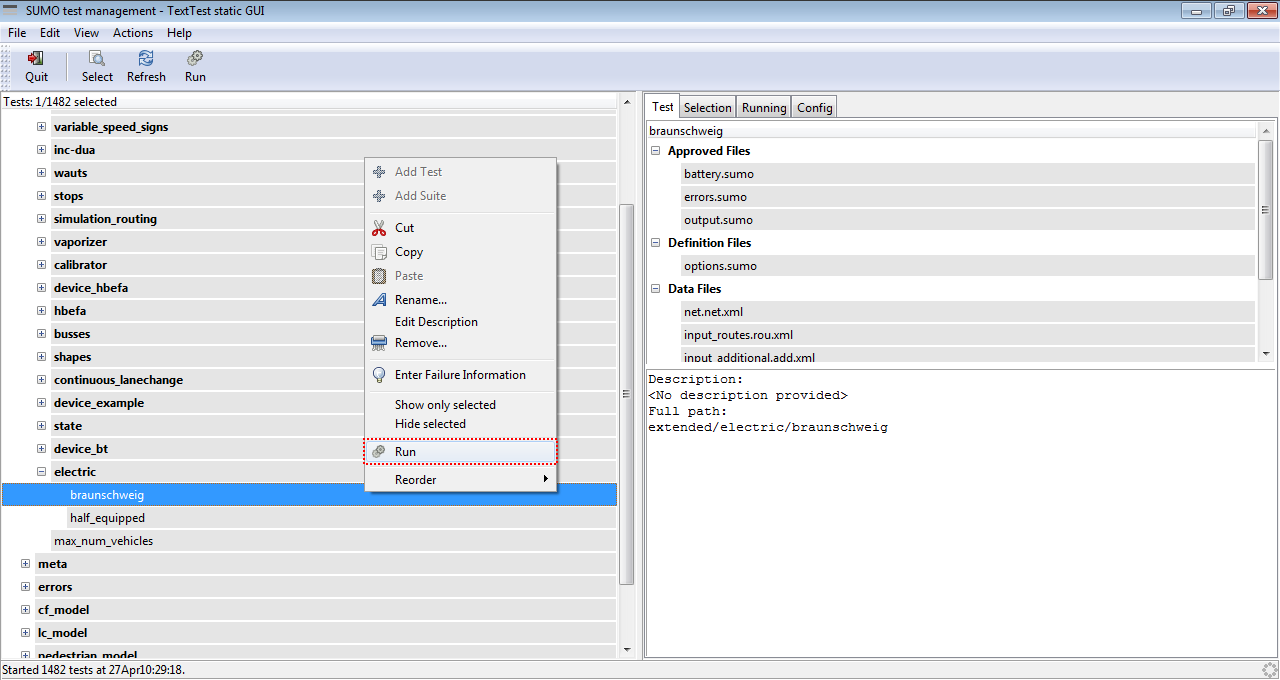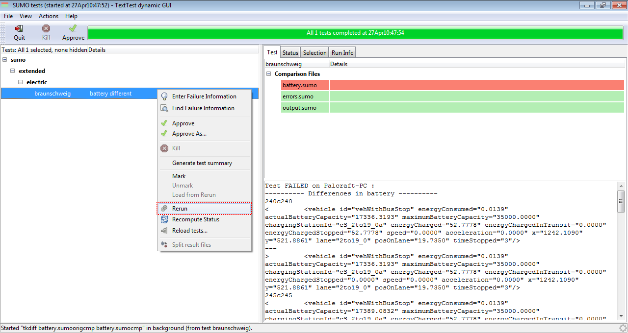 The main function of existing test is to verify that a modification of a function does not affect the final output, comparing the output of our modification in SUMO with a with an previously tested output control file. Note that SUMO must be compiled in release mode for testing. To show an example of use, the MSDevice_Battery.cpp file will be modified to include an error in the output file battery.xml. Once modified the line, run executable runSumoTests.bat and find the test sumo/extended/electric/braunschweig, and then right click to run the test