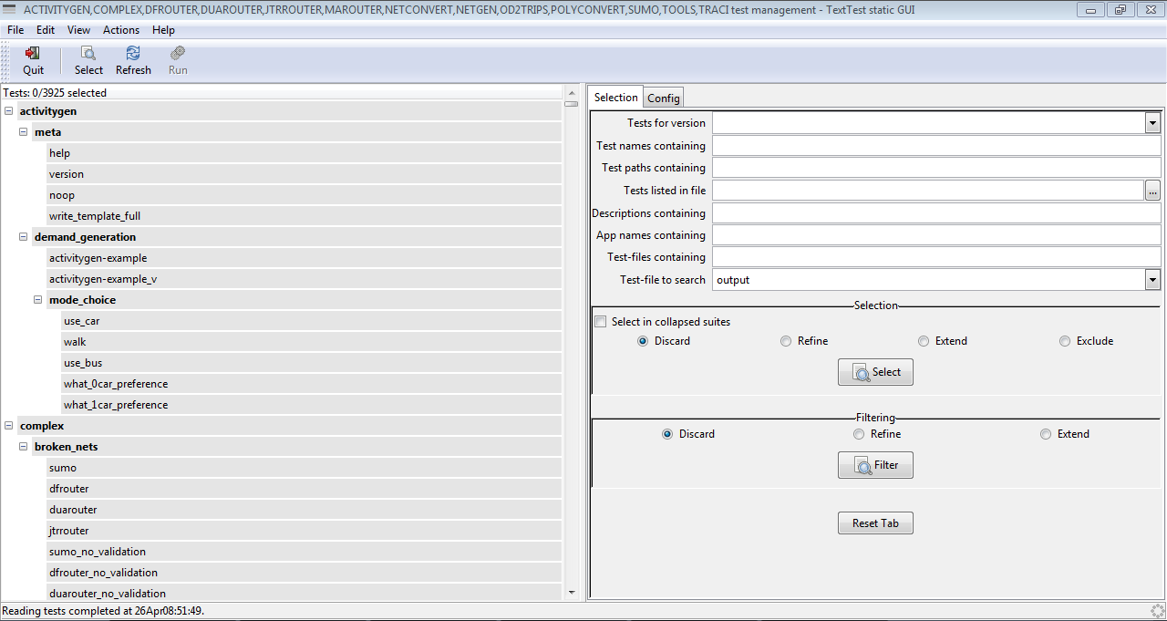 We use TextTest to test whether the software still behaves as expected. TextTest compares an application's file output, including the output to stdout and stderr with predefined outputs from files.
