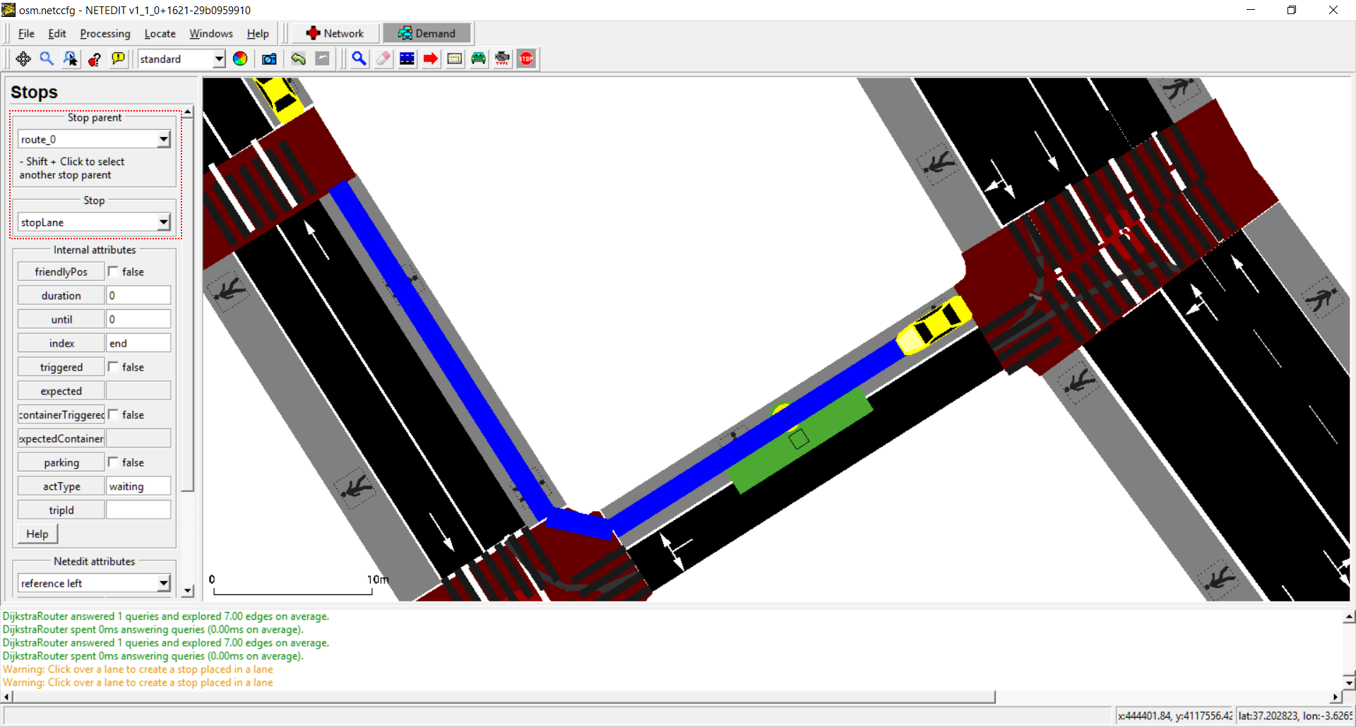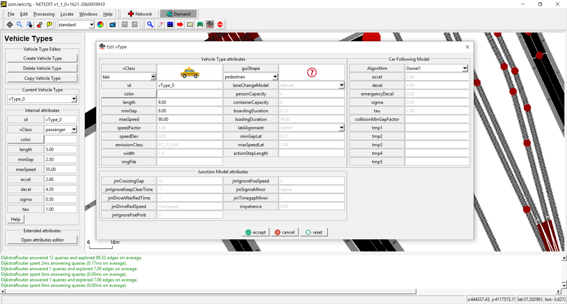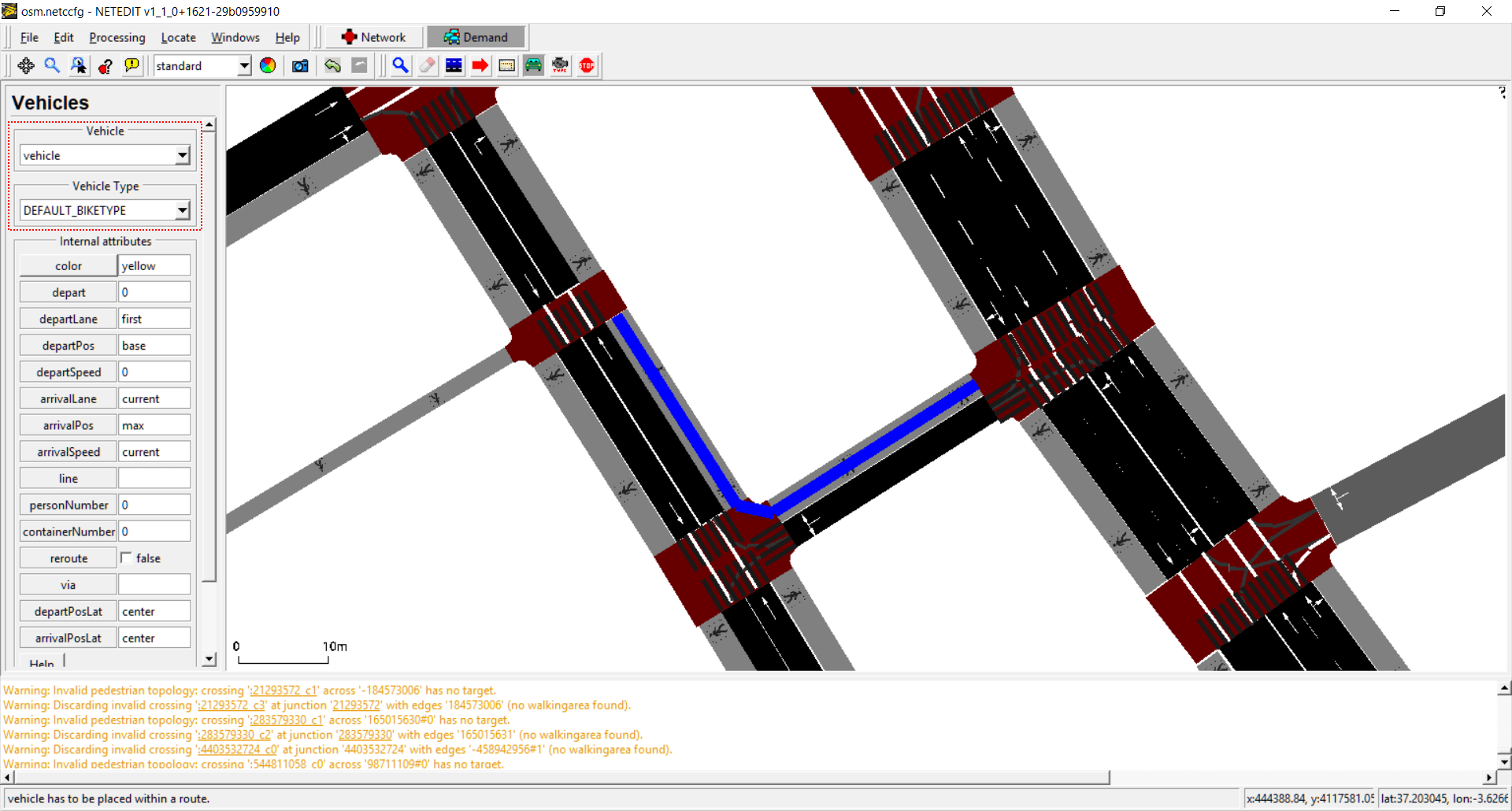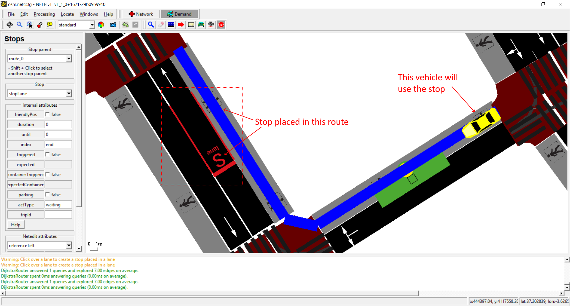 Vehicles, flows and trips can be created using this mode. The term "vehicle" includes three different elements: Vehicles, flows (both placed over a Route) and Trips (placed over a "from" edge). Also every vehicle need to have a "Vehicle Type", therefore both parameters has to be selected in both list of left frame.