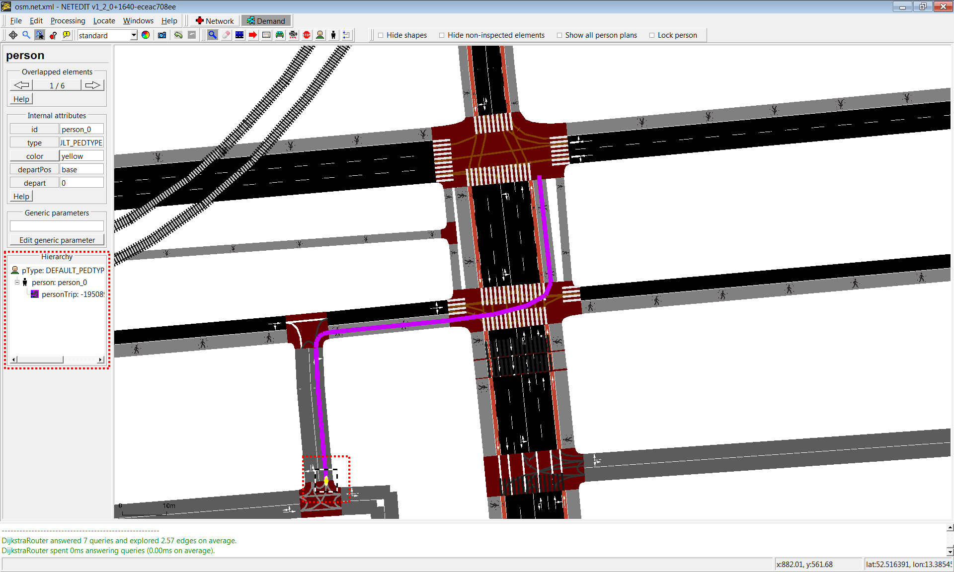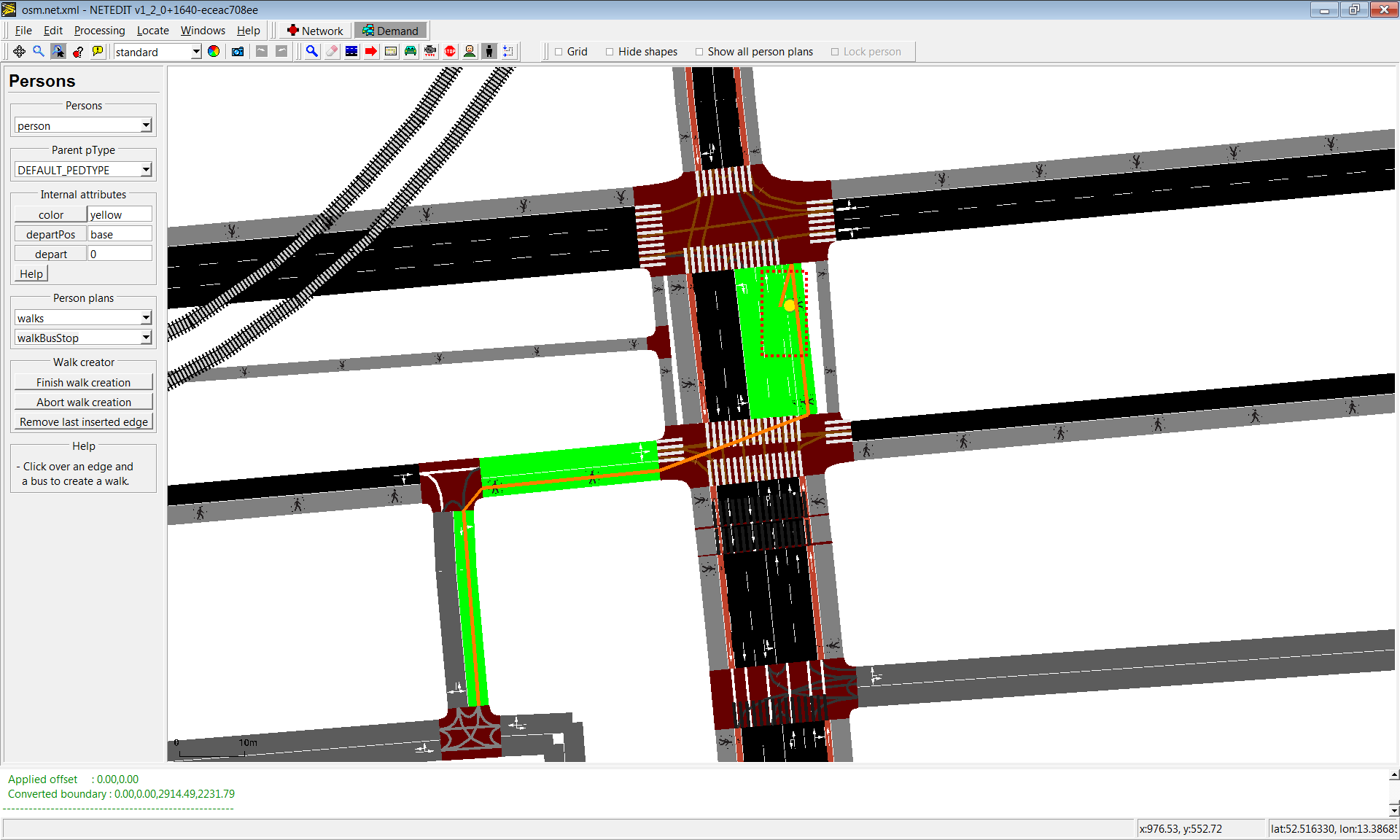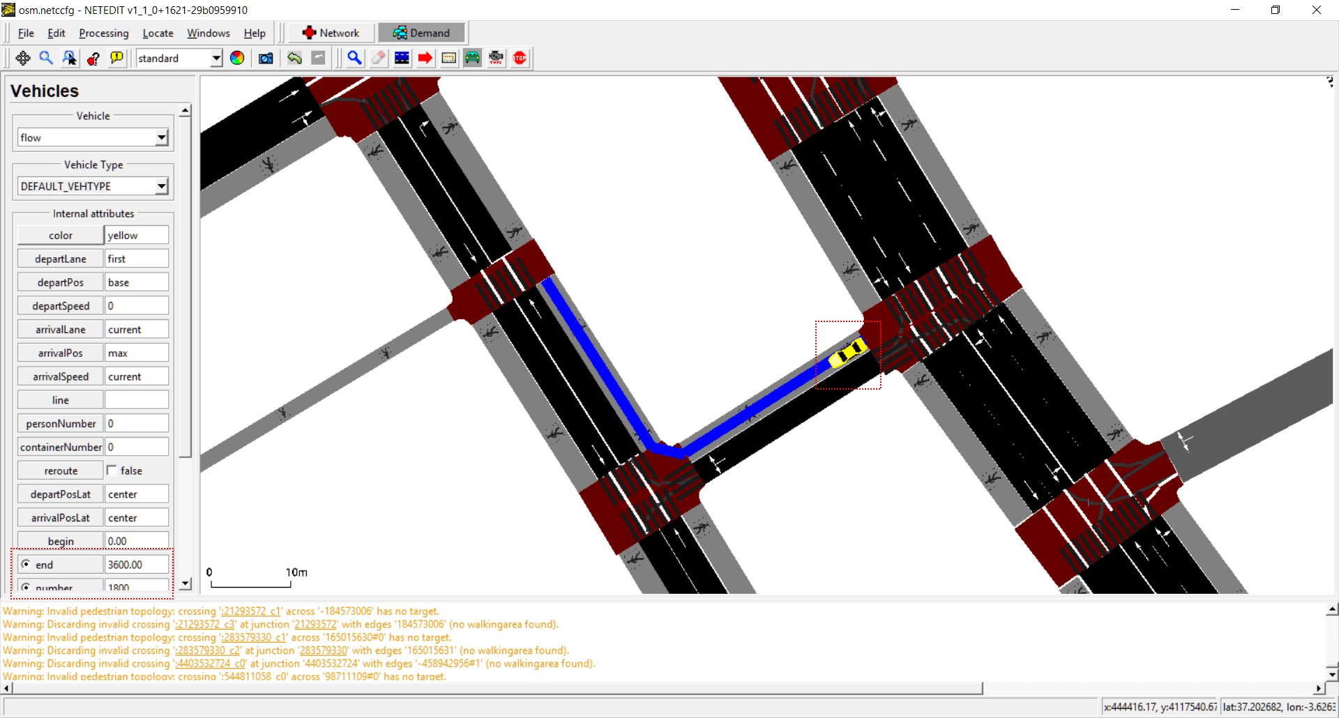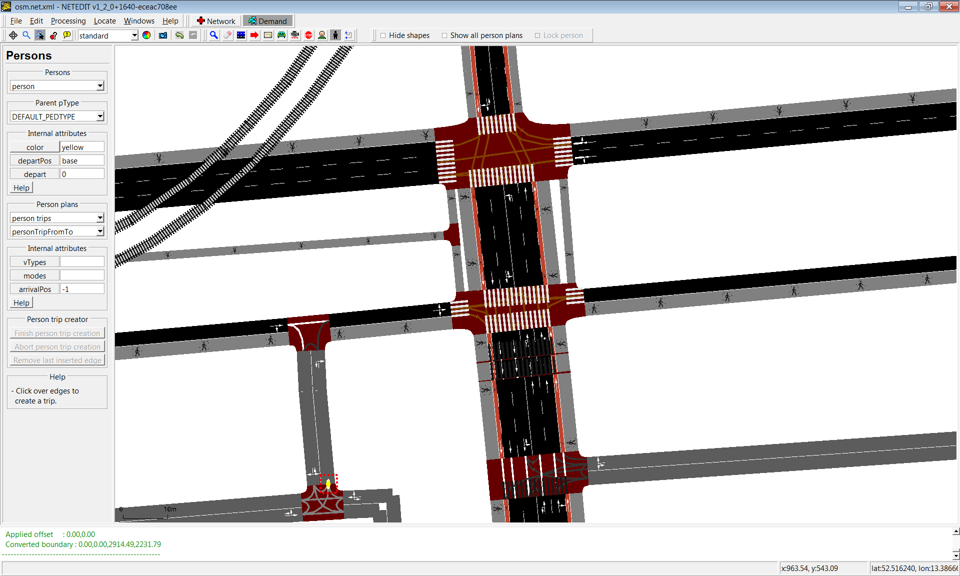 Vehicles, flows and trips can be created using this mode. The term "vehicle" includes three different elements: Vehicles, flows (both placed over a Route) and Trips (placed over a "from" edge). Also every vehicle need to have a "Vehicle Type", therefore both parameters has to be selected in both list of left frame.