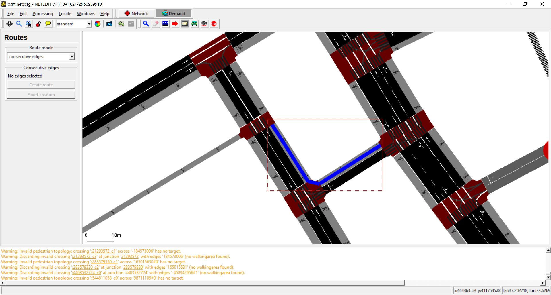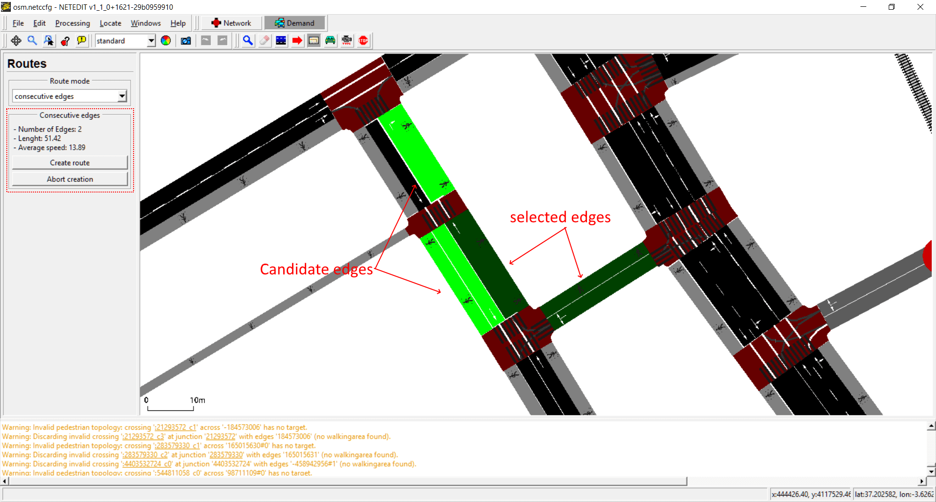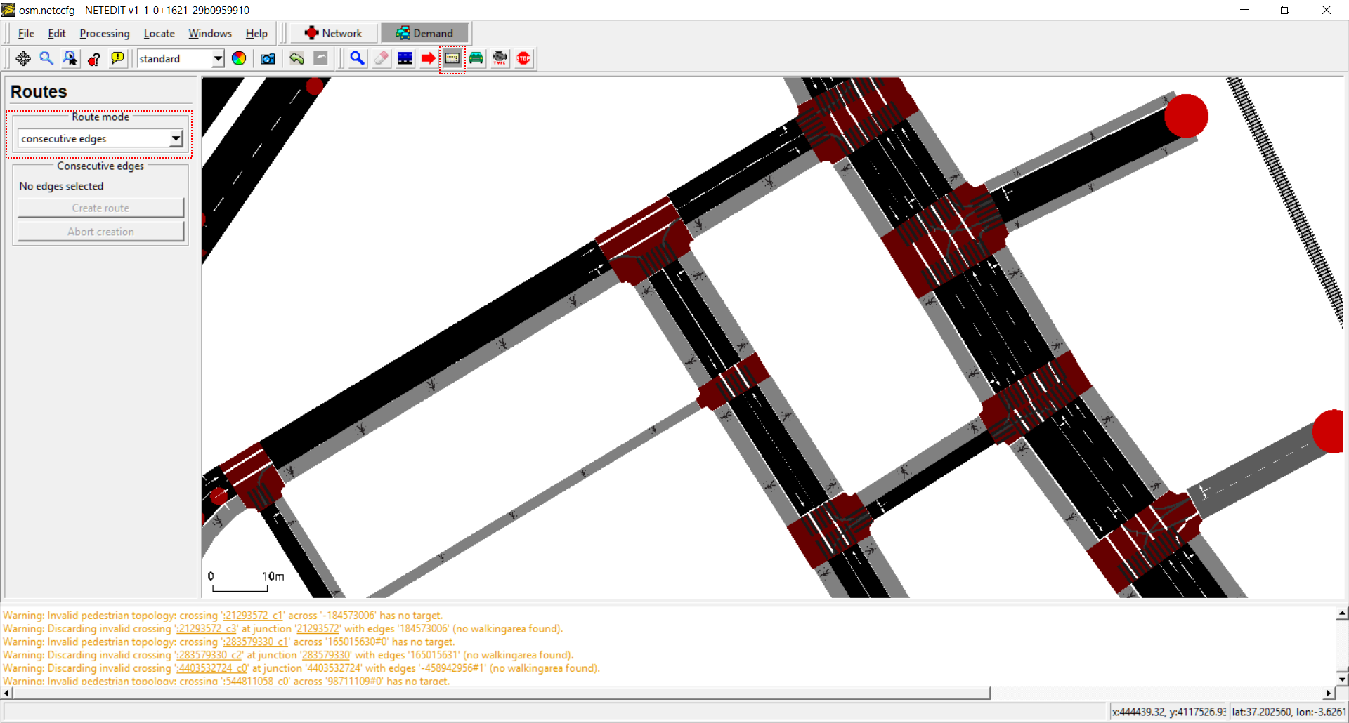 New route over the current infrastructure can be created using this mode. Routes are created clicking over consecutive edges (marked with different colors) and pressing "create route" button or Enter key. Route creation can be aborted using "abort creation" button or pressing ESC key. Note that Routes can be created between edges that aren't connected thought a connection.