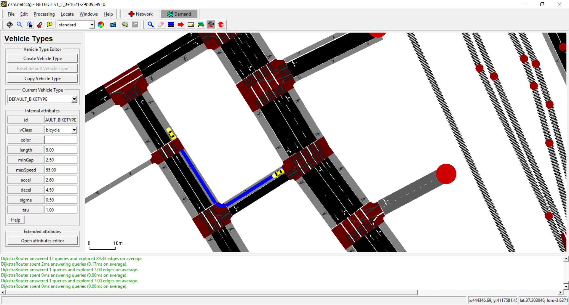 Vehicle types can be created and edited using Vehicle Type mode. A vehicle Type isn't a visual element that can be observed in the view, but is an "abstract" element that have a big influence in other elements (for example, vehicles). Every simulation has always two default vehicle types for Vehicles and Bikes. This default vehicle type can be edited but not deleted, and only is written in XML if one of their default value is modified. Due a Vehicle Type has a big number of parameters, only the most relevant parameters can be edited in left frame. To edit advanced parameters, use the Vehicle Type Dialog opened thought "Open attribute editor" button.