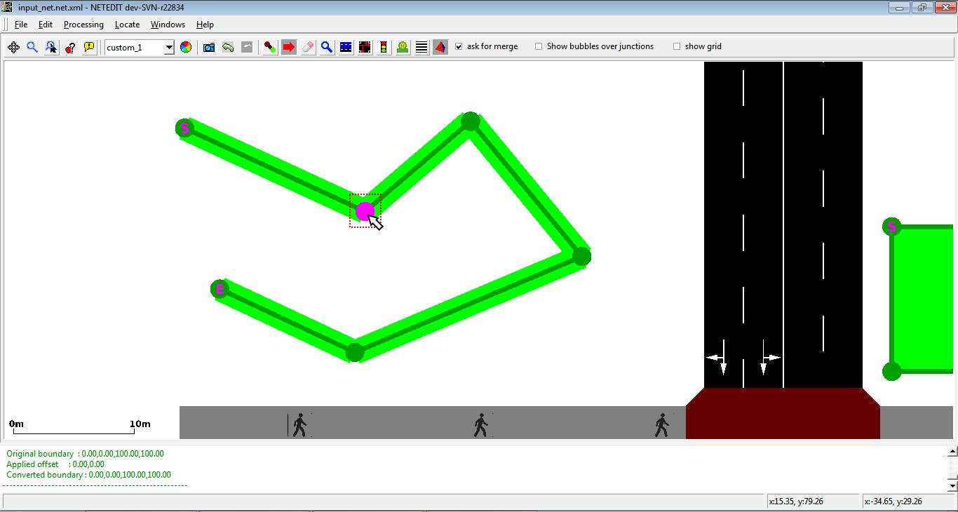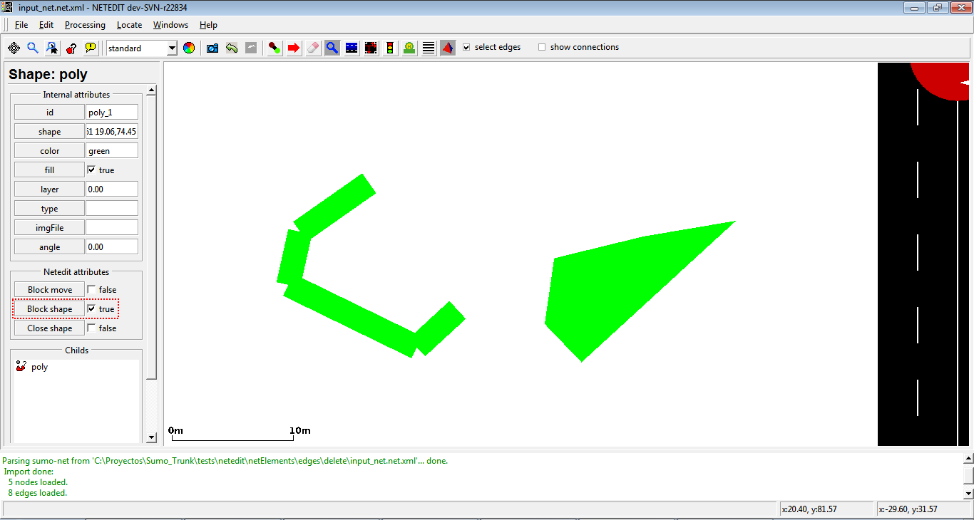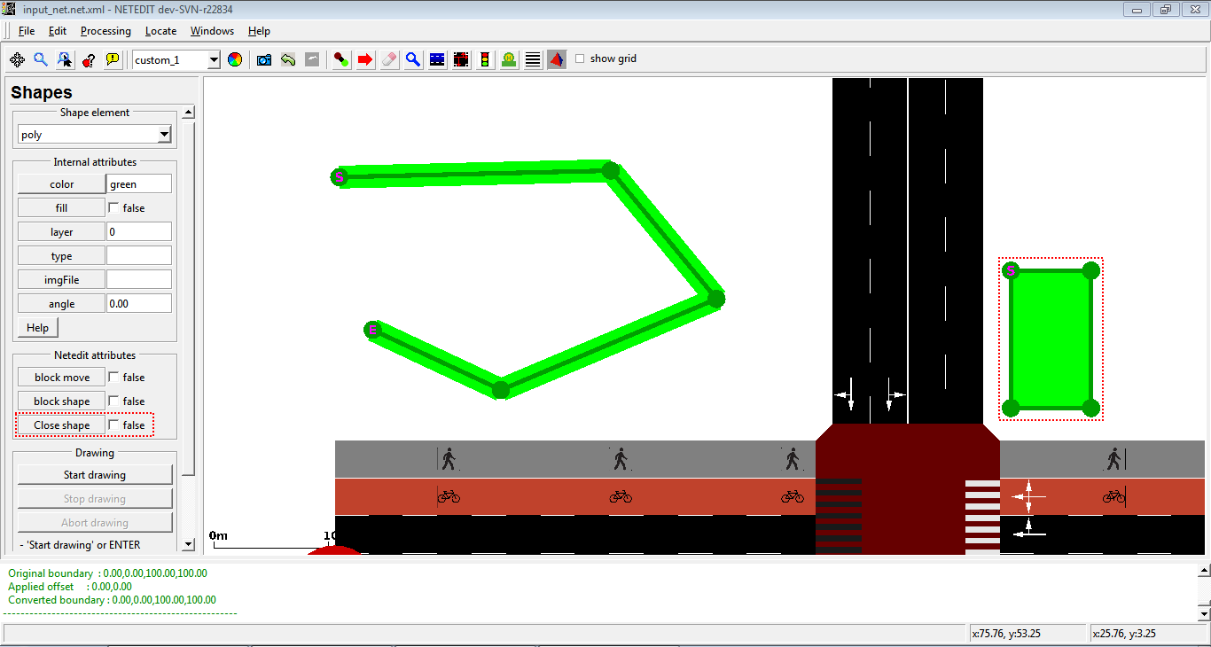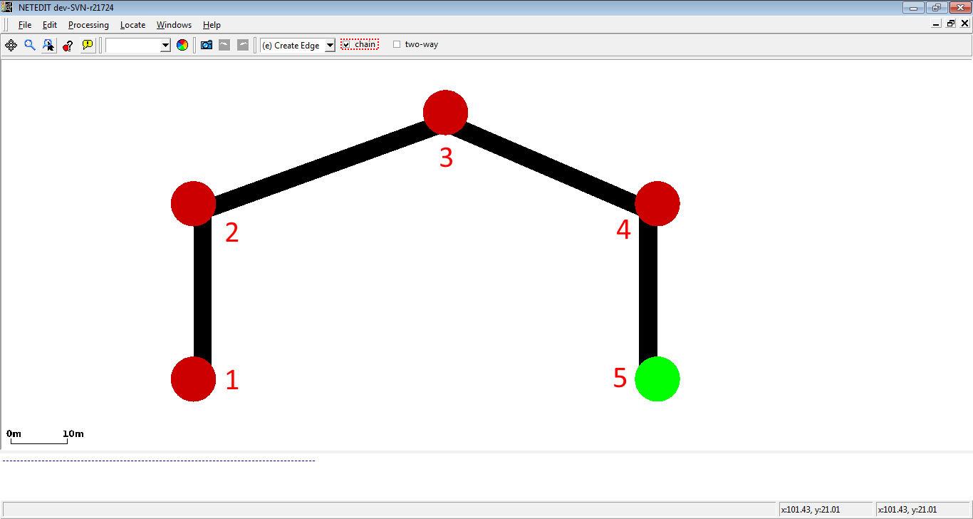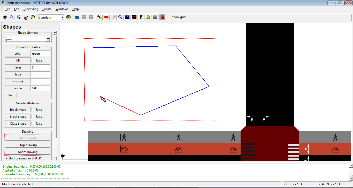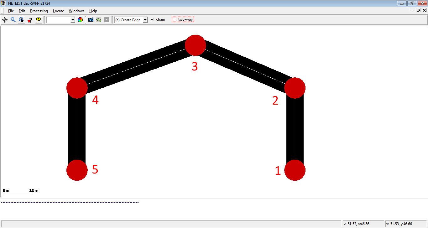 This mode creates edges (lanes) and implicitly junctions. The edge attributes will be taken from the current Edge template. If no template is set, default options such as default.lanenumber will be used.