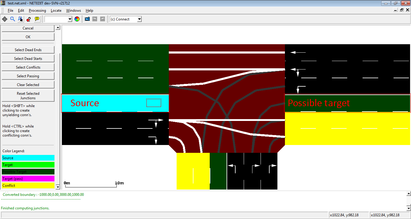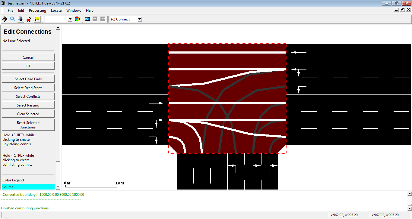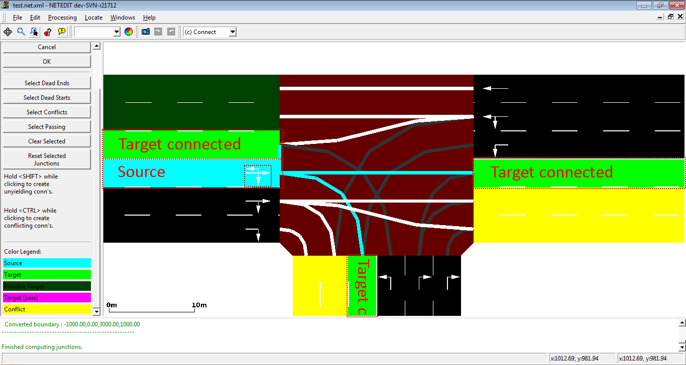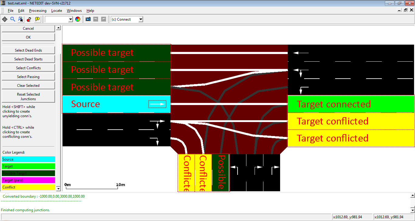 When a new junction is created, or their edges are modified, a set of new connections is automatically created. But netedit allows also to customize the connections of a lane using the connection mode. When a source lane is selected in connection mode all outgoing lanes at the junction are colored according to the categories below: