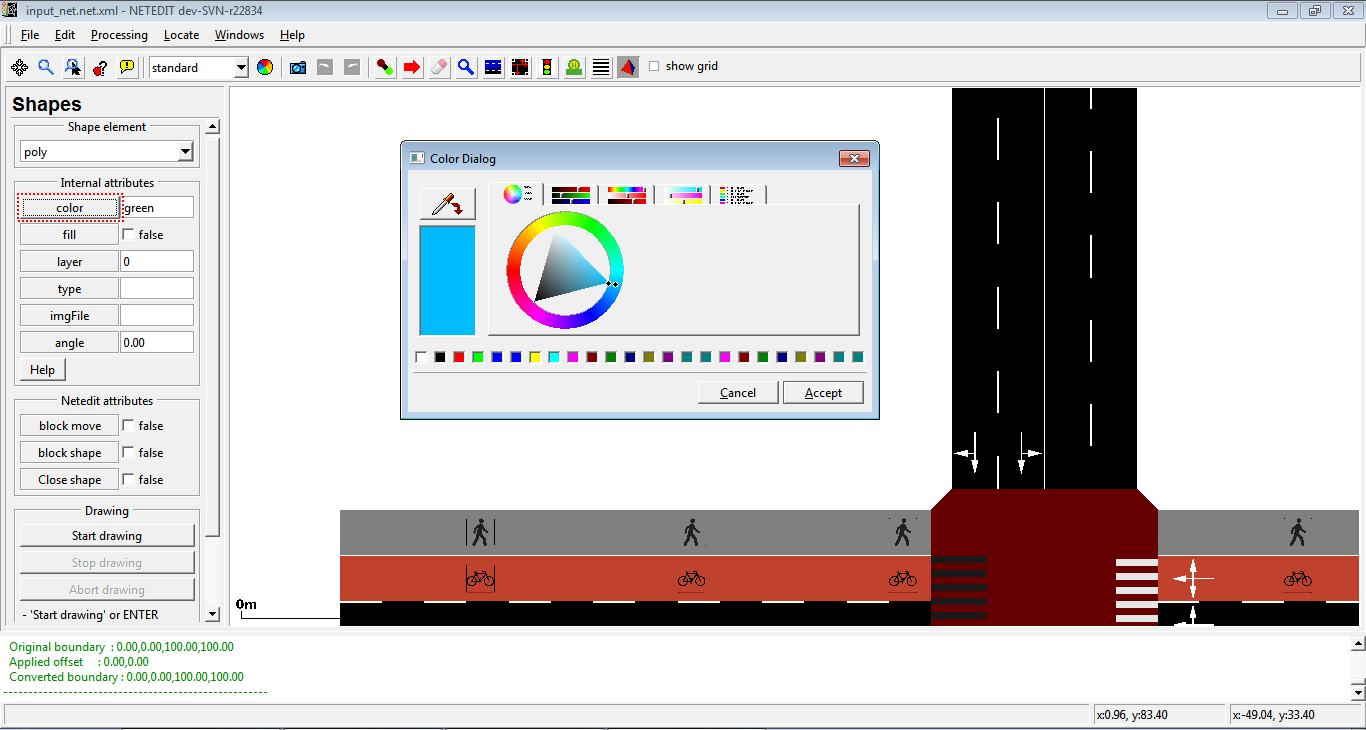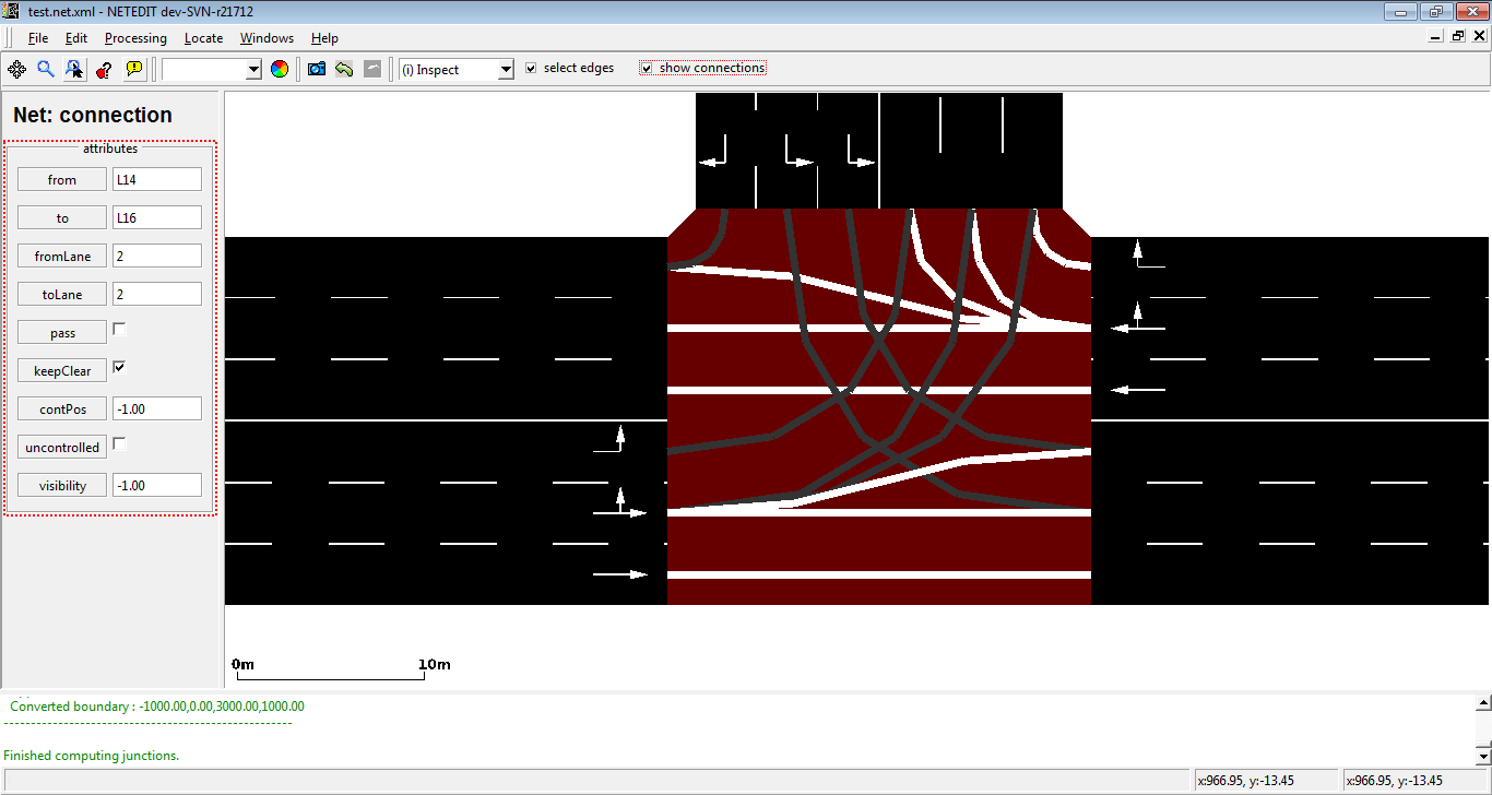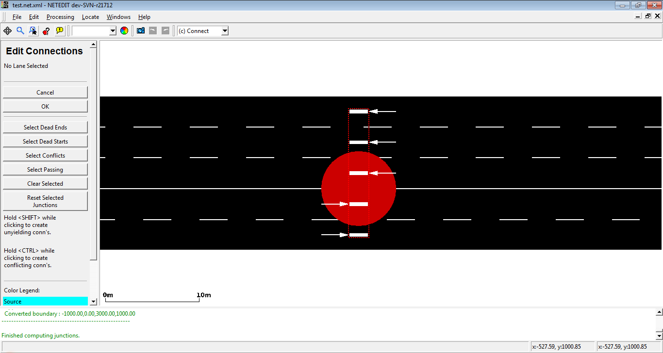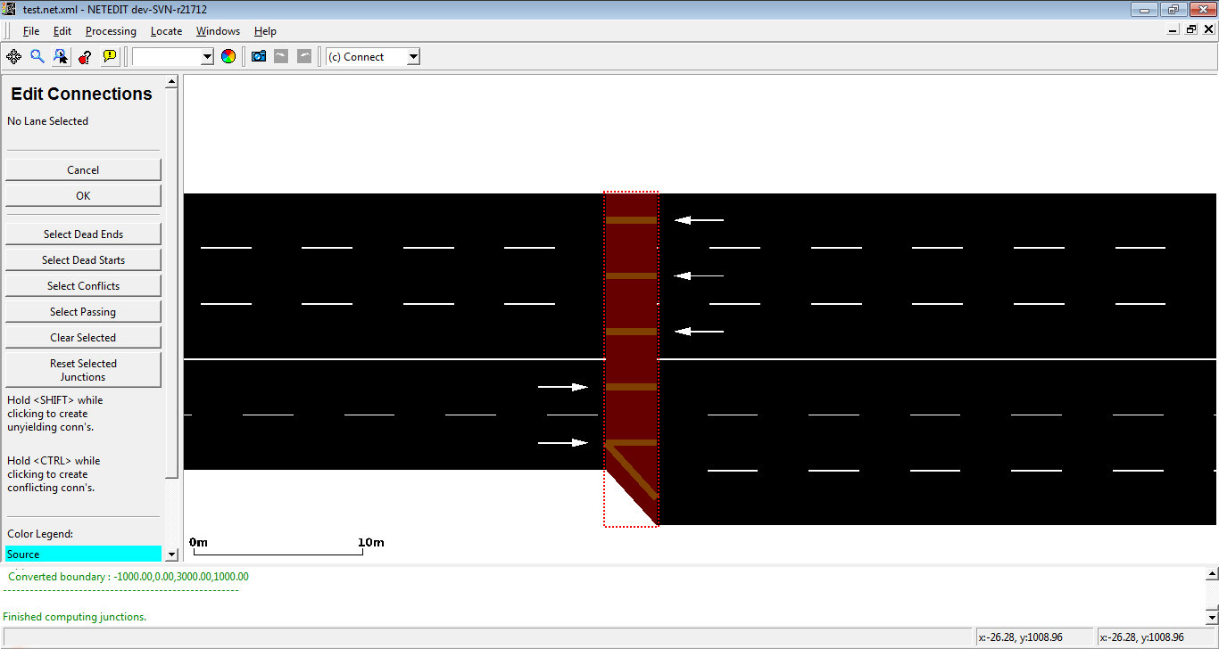 When a new junction is created, or their edges are modified, a set of new connections is automatically created. But netedit allows also to customize the connections of a lane using the connection mode. When a source lane is selected in connection mode all outgoing lanes at the junction are colored according to the categories below: