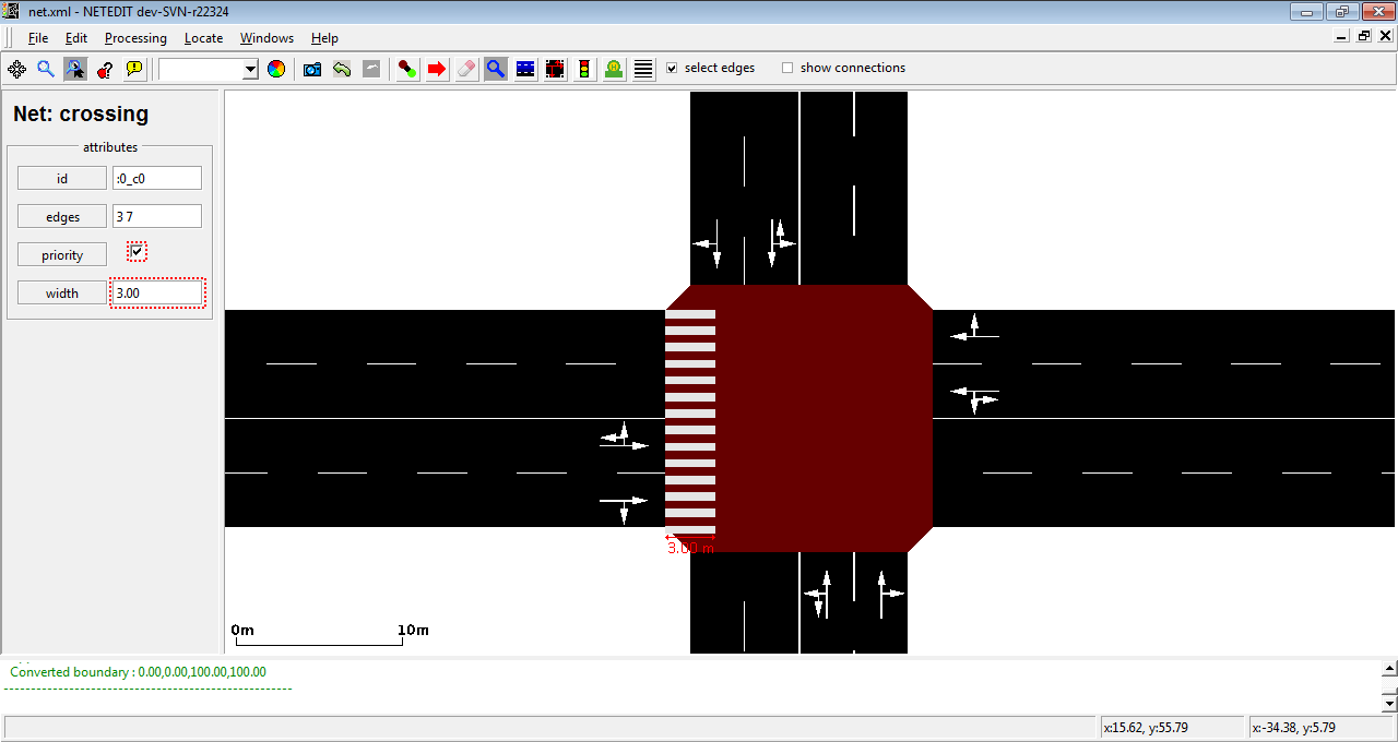 Add pedestrian crossings for use with pedestrian simulation. Crossings are define relative a junction and edges at this junction. Their width can be customized and they can either be configured as prioritized (zebra stripes) or unprioritized (vehicles have right of way). Crossings are added using the following steps: