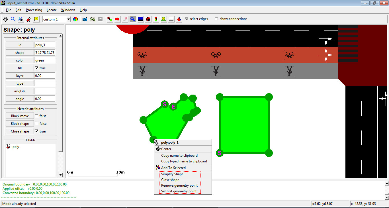 This mode allows the creation of Polygons and POIs (Points of Interest) through Polygon mode (hotkey ‘P’). These objects are used for visualization and can also be accessed via TraCI. In the polygon frame you can select the type of shape to edit (Polygons or Point Of Interest), and the corresponding parameters for each one.
