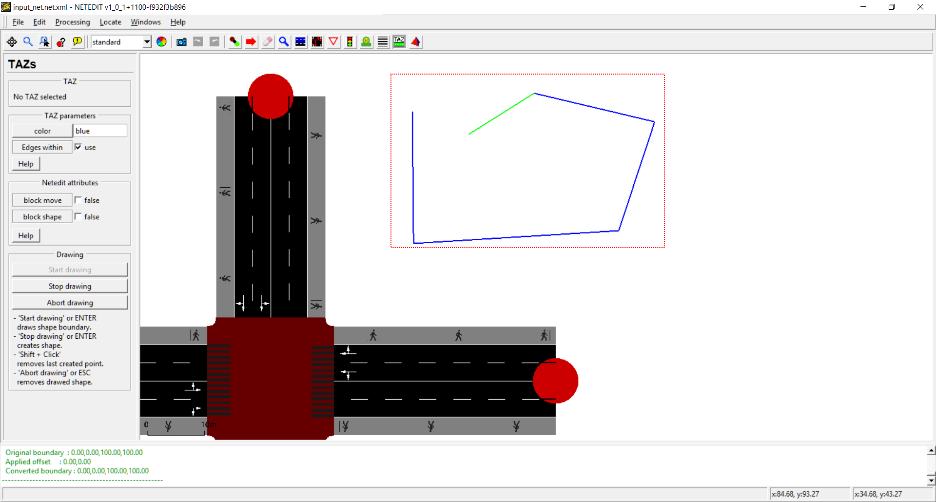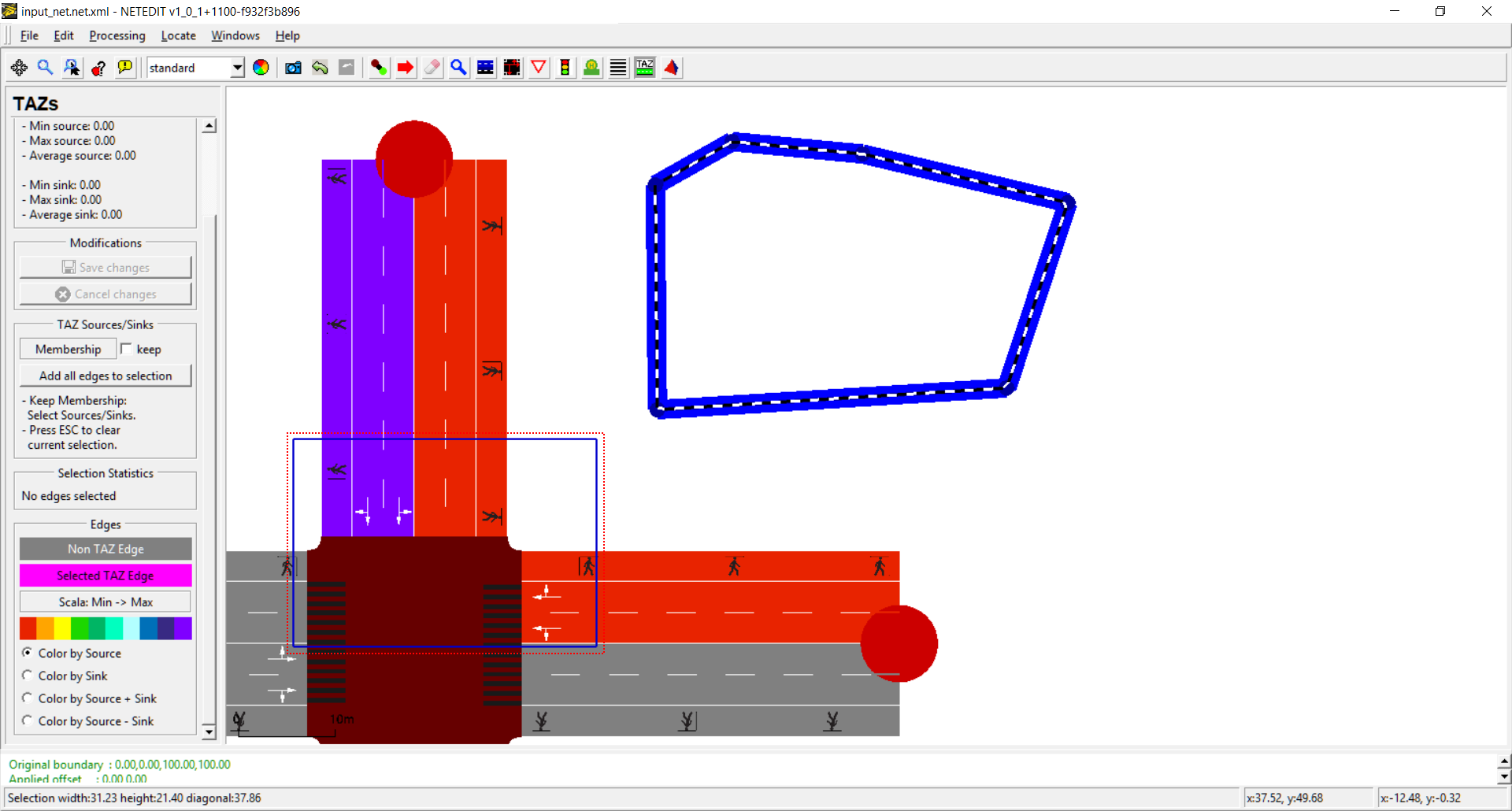 This mode allows creating and editing TAZ. (Shortcut Z). TAZs are composed of a closed polygon and a list of edges associated with certain weights for the inputs (Sources) and outputs (Sinks) (Similar to a Flow Network).