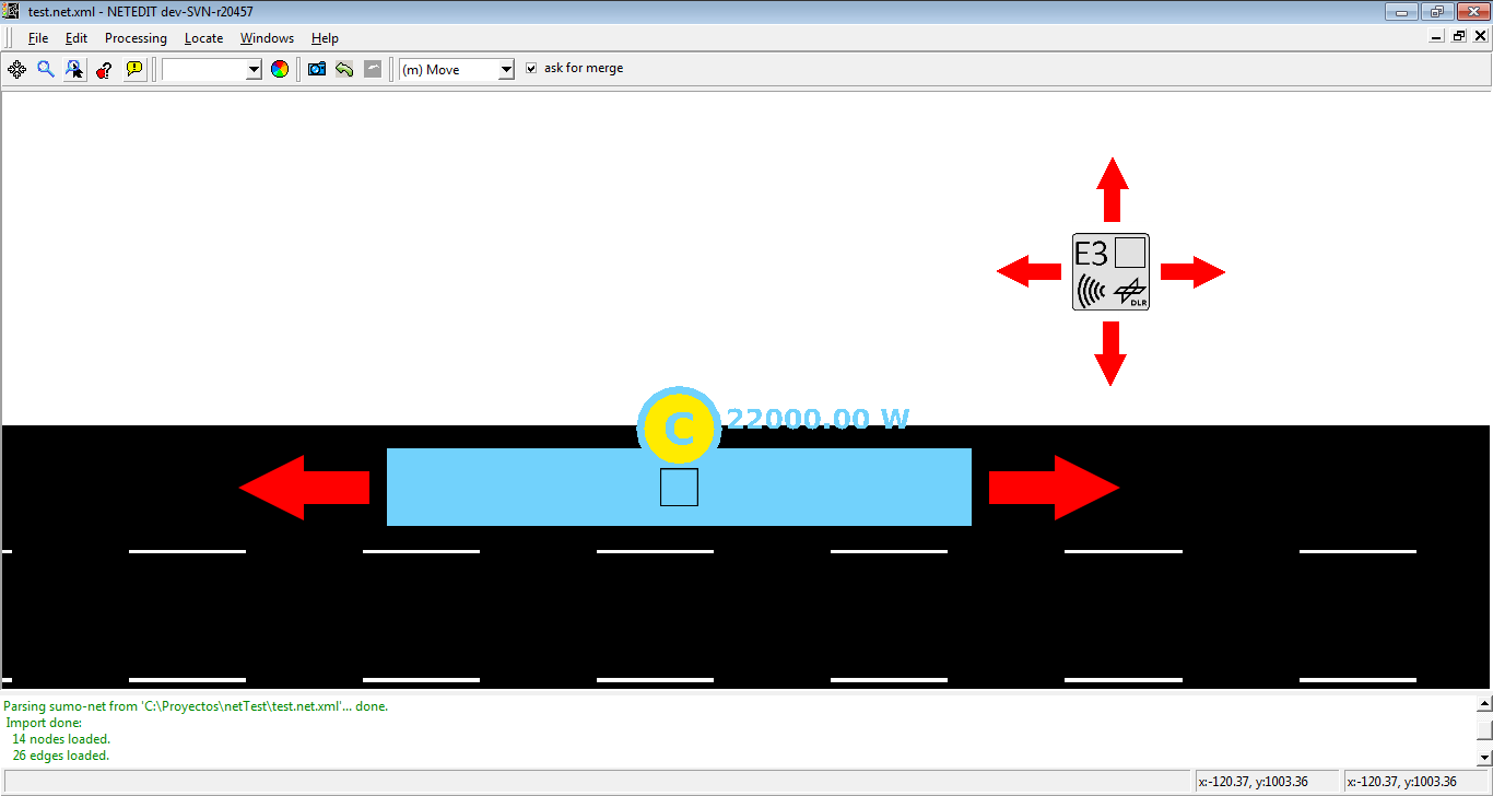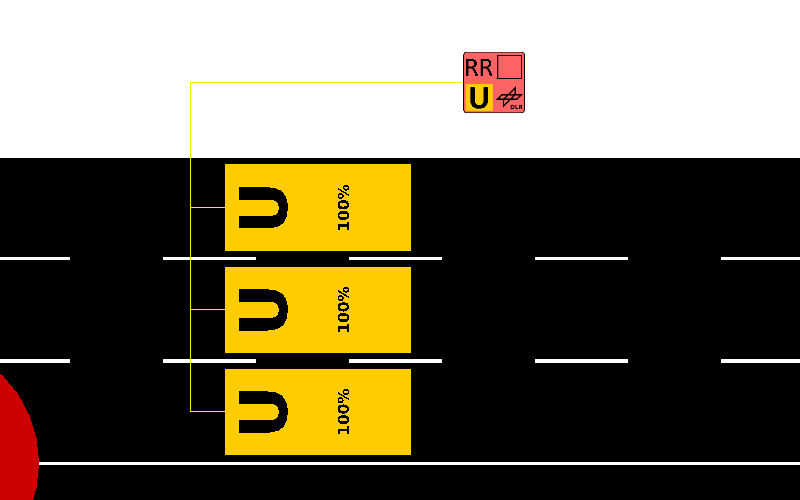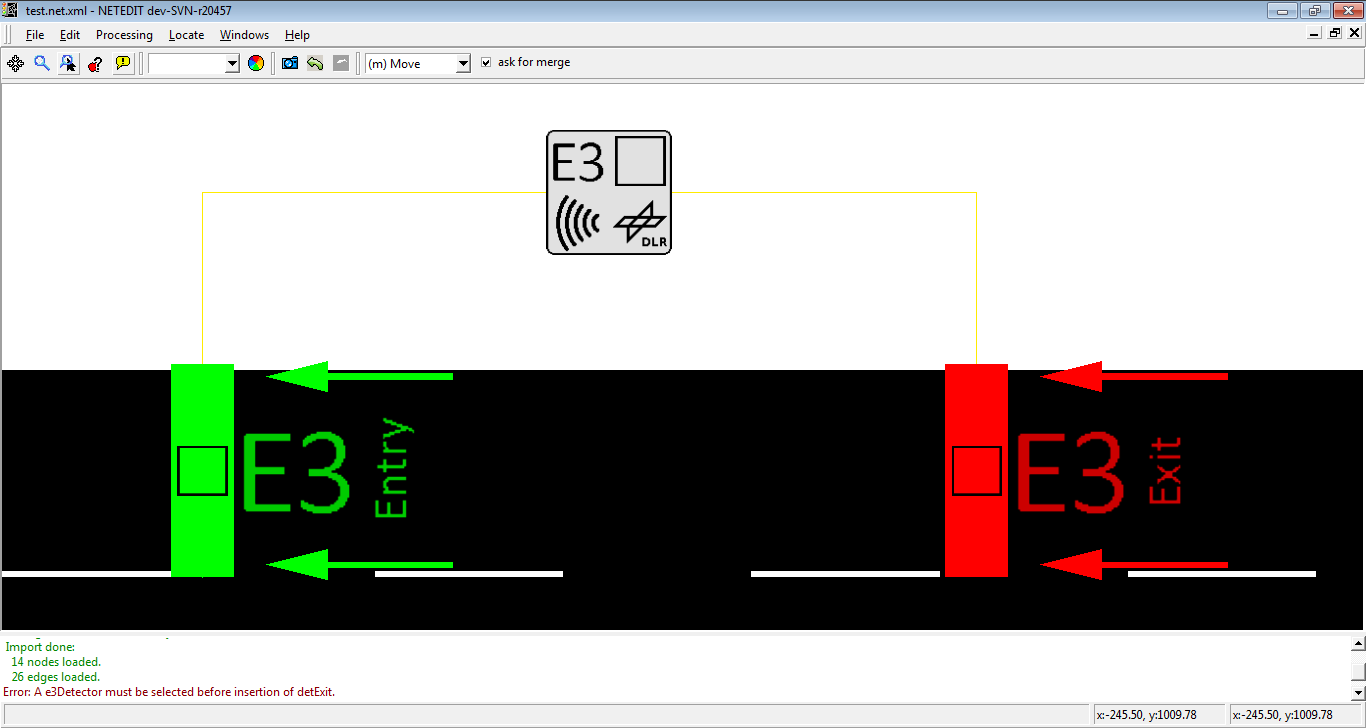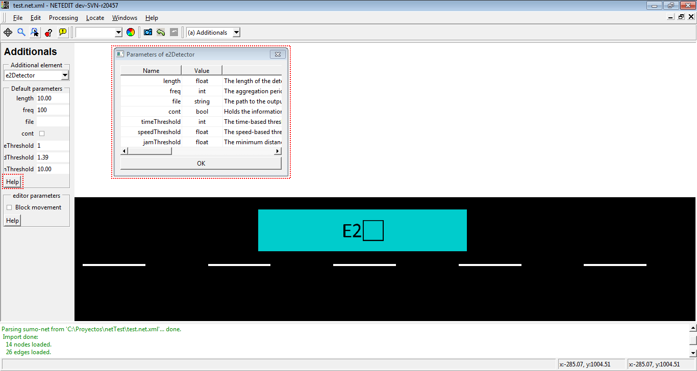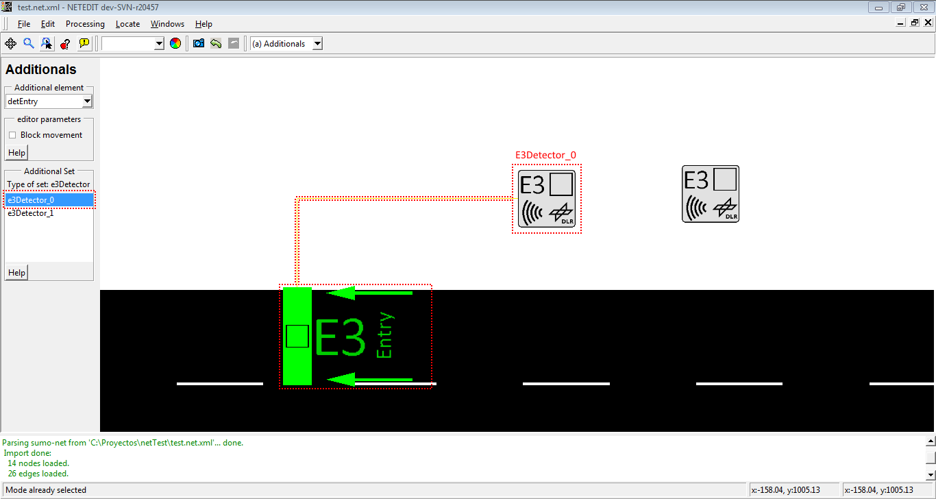Additional sets are additionals that comprise or contain another additionals (called childs) (For example, detectorE3 contains a list of detEntry and detExit). Additional sets are inserted in the same way as an Additional, but the insertion of an additional child is different. Before the insertion of an additional child in the map, the ID of the additionalSet parent must be selected in the list of IDs placed on the left frame. In this list the IDs of the additional sets only appear when they can be parents of the additional child (Referring to the given example: if the user wants to insert a detEntry, than only IDs of detectorE3 will appear in the list on the left frame). Additional sets and their childs are graphically connected by a yellow line.