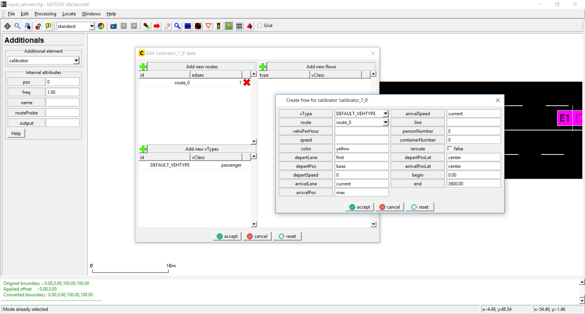 A calibrator generates a flow of vehicles during a certain time, and allows dynamic adaption of traffic flows and speeds. A calibrator can be used to modify a simulation scenario based on induction loop measurements. It will remove vehicles in excess of the specified flow and will insert new vehicles if the normal traffic demand of the simulation does not reach the specified number of vehsPerHour. Furthermore, the defined edge speed will be adjusted to the specified speed similar of the operation of a variable speed sign. Calibrators will also remove vehicles if the traffic on their lane is jammed beyond the specified flow and speed. This ensures that invalid jams do not grow upstream past a calibrator. A double click over the calibrator icon opens the values editor.