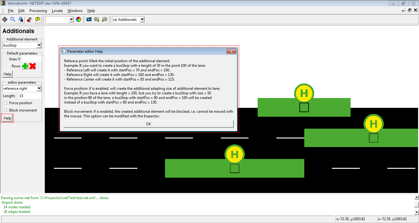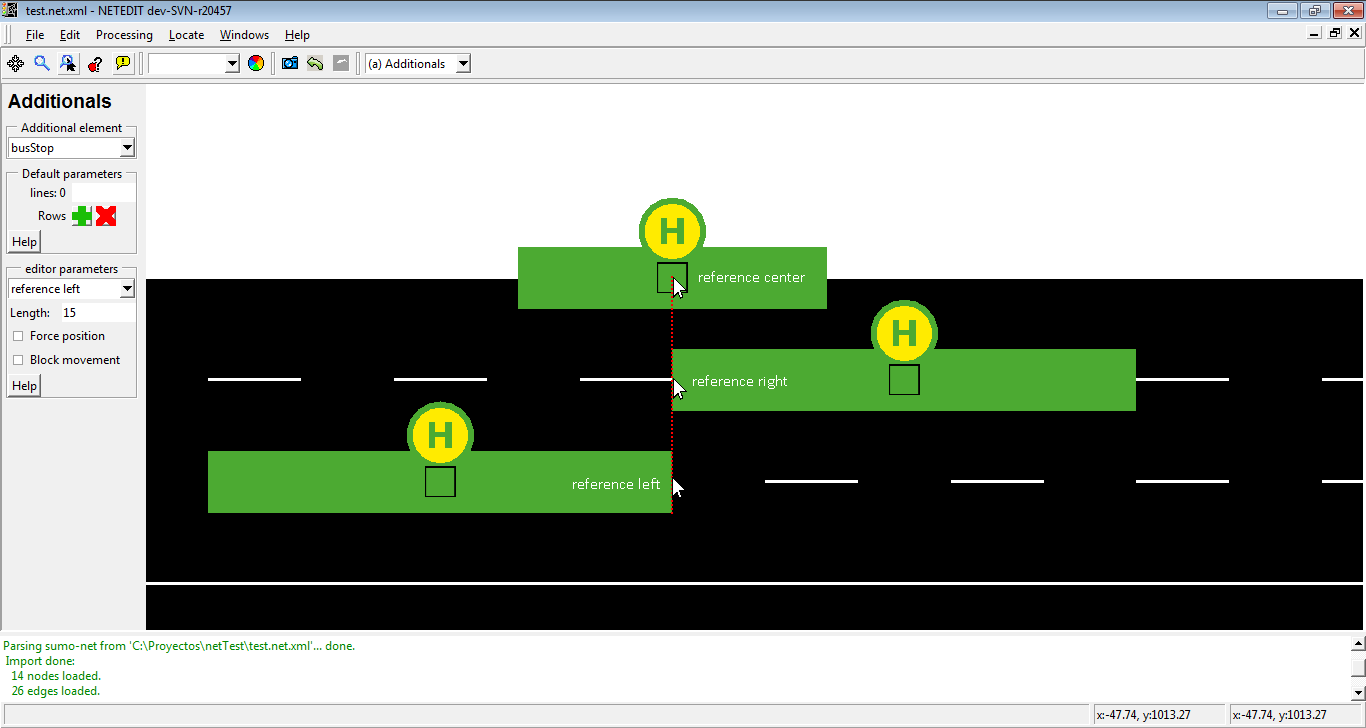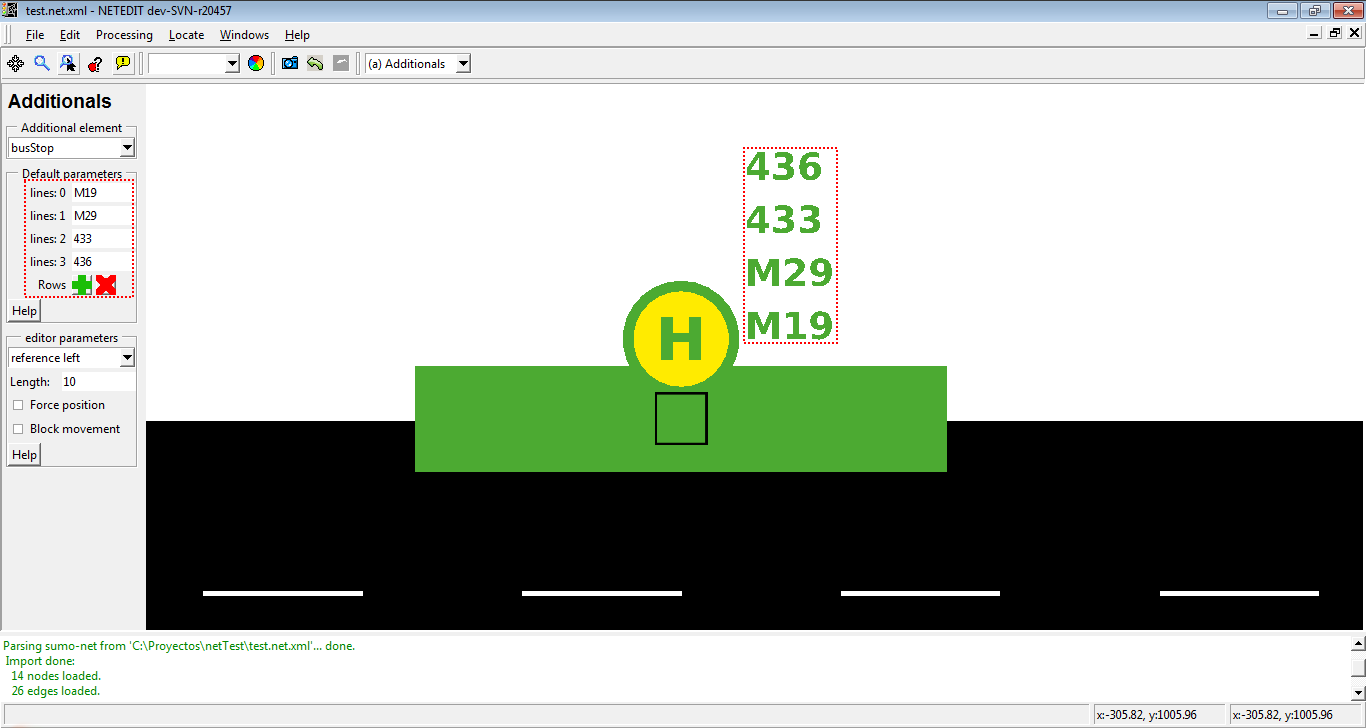 Bus stops are positions of a lane in which vehicles ("busses") stop for a pre-given time. Every Bus stop has an unique ID assigned automatically by netedit, a length and a list of bus lines defined by the user.