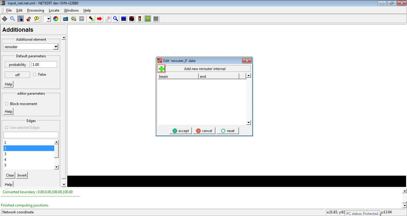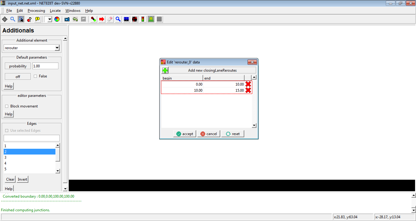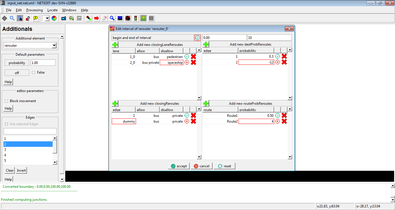 A double click over the rerouter icon opens the values editor. Rerouter's values are divided in intervals, and every interval contains a list of closing streets, closing lanes, assignations of new destinations and assignations of new routes: