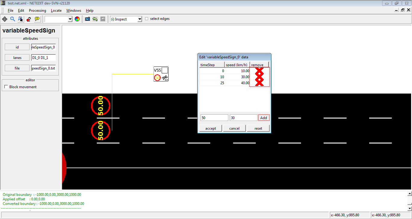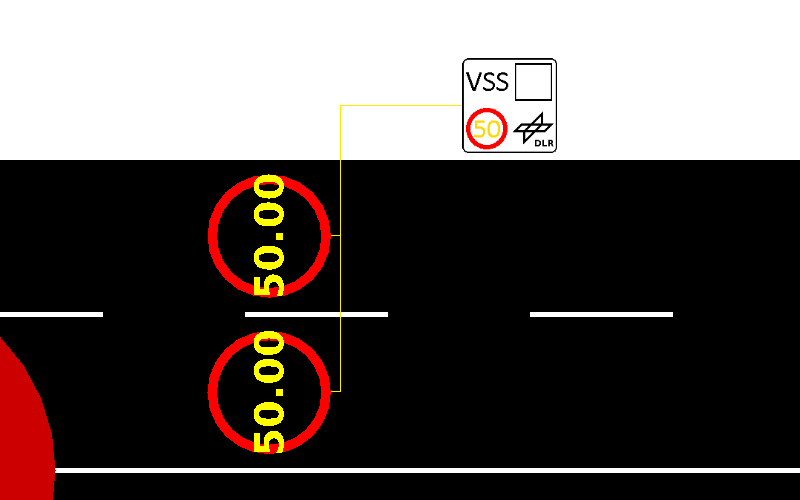 A Variable Speed Signal modifies the speed of a set of lanes during a certain time defined by user. A double click over the Variable Speed Signal icon opens the values editor.