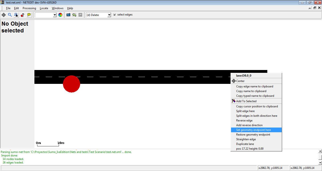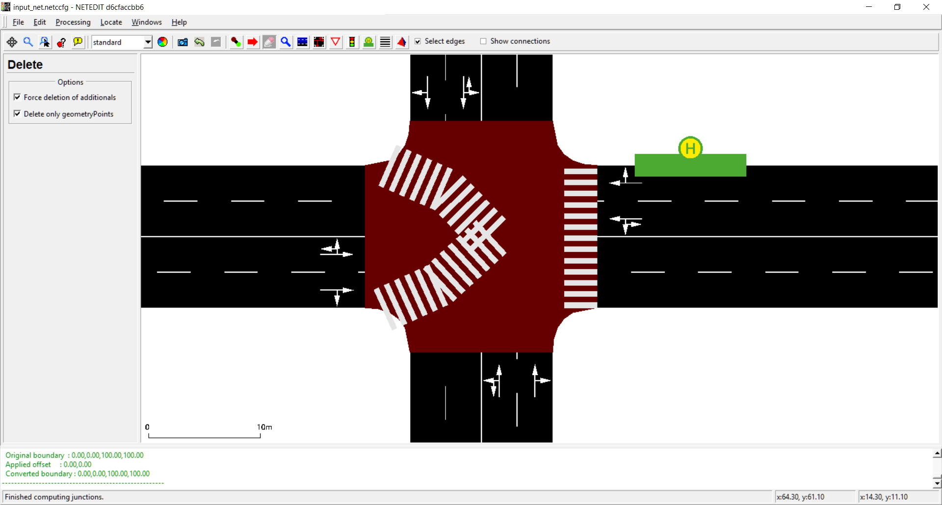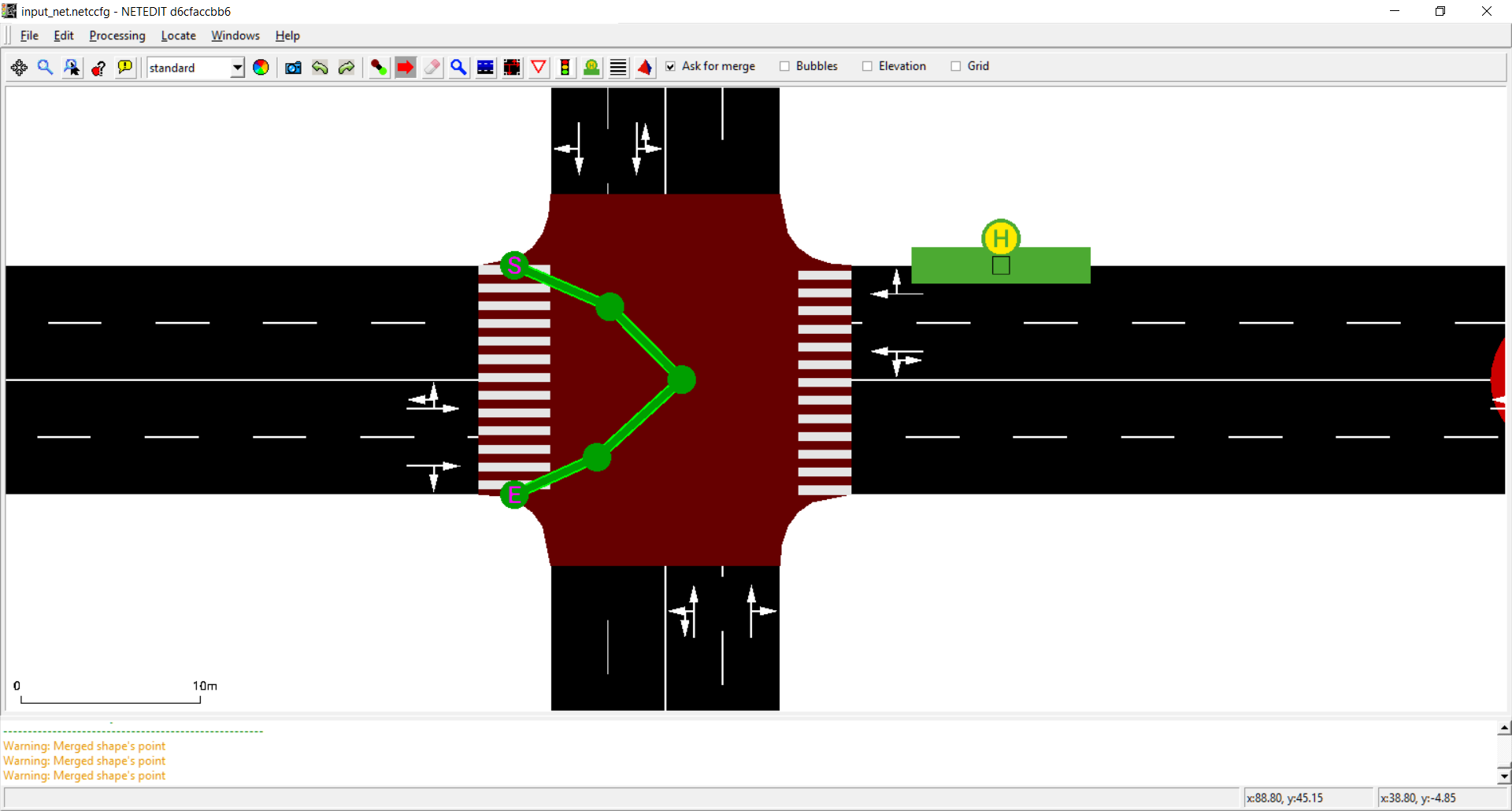 - Set custom shape: Allows drawing a custom junction shape via a Modifiable Poly (see below). The junction shape determines where the incoming edges end and the outgoing edges start. If the automatic generation of shapes does not give a satisfying result it often helps to draw a custom shape instead. The shape is a polygon defined by a sequence of (x,y,z) geometry points.