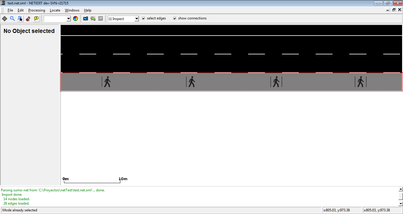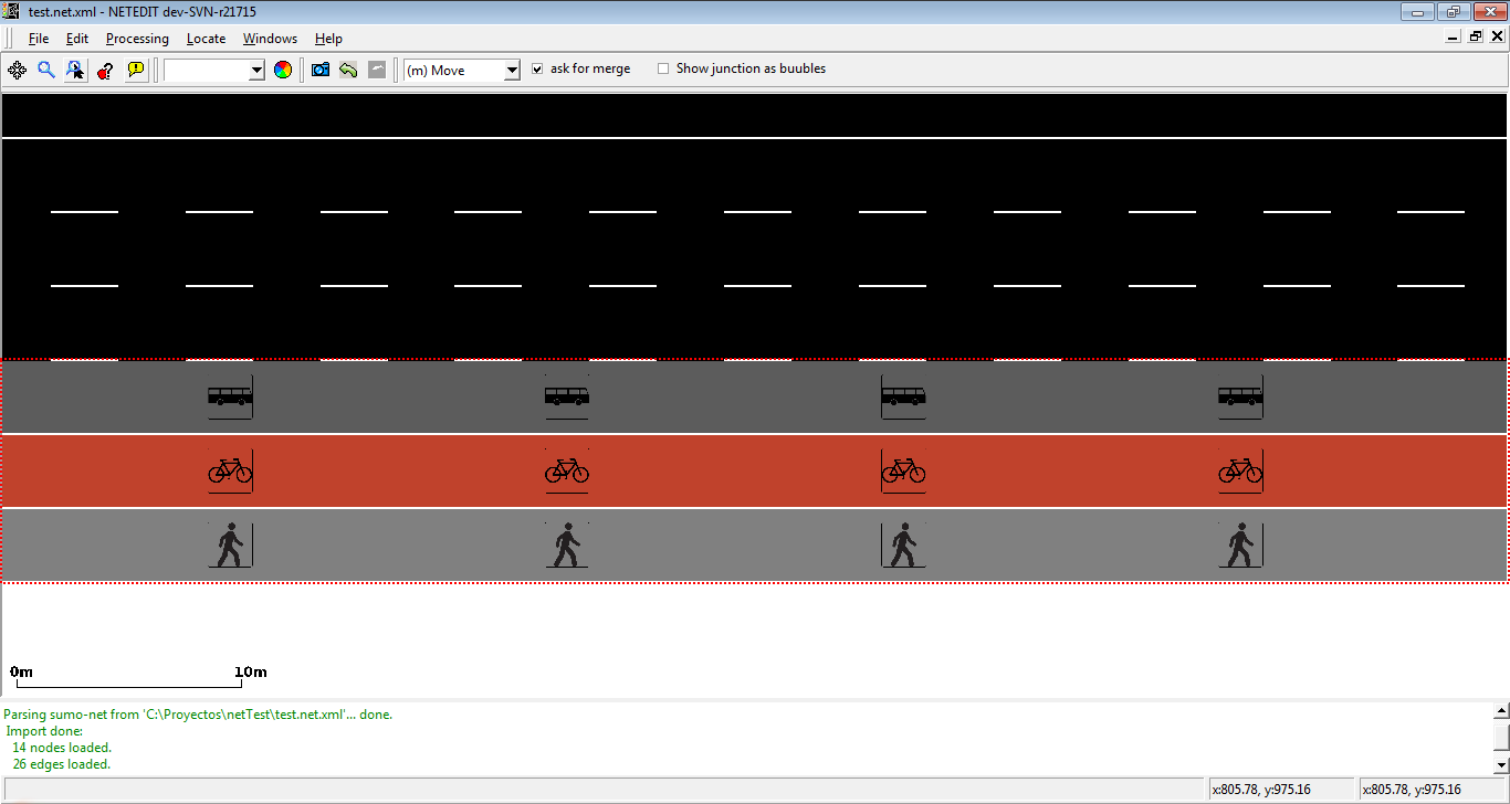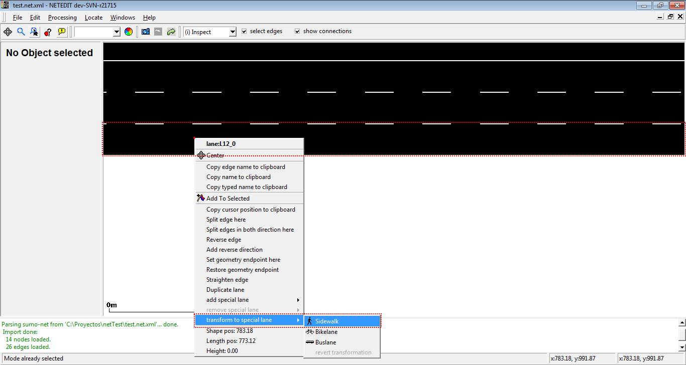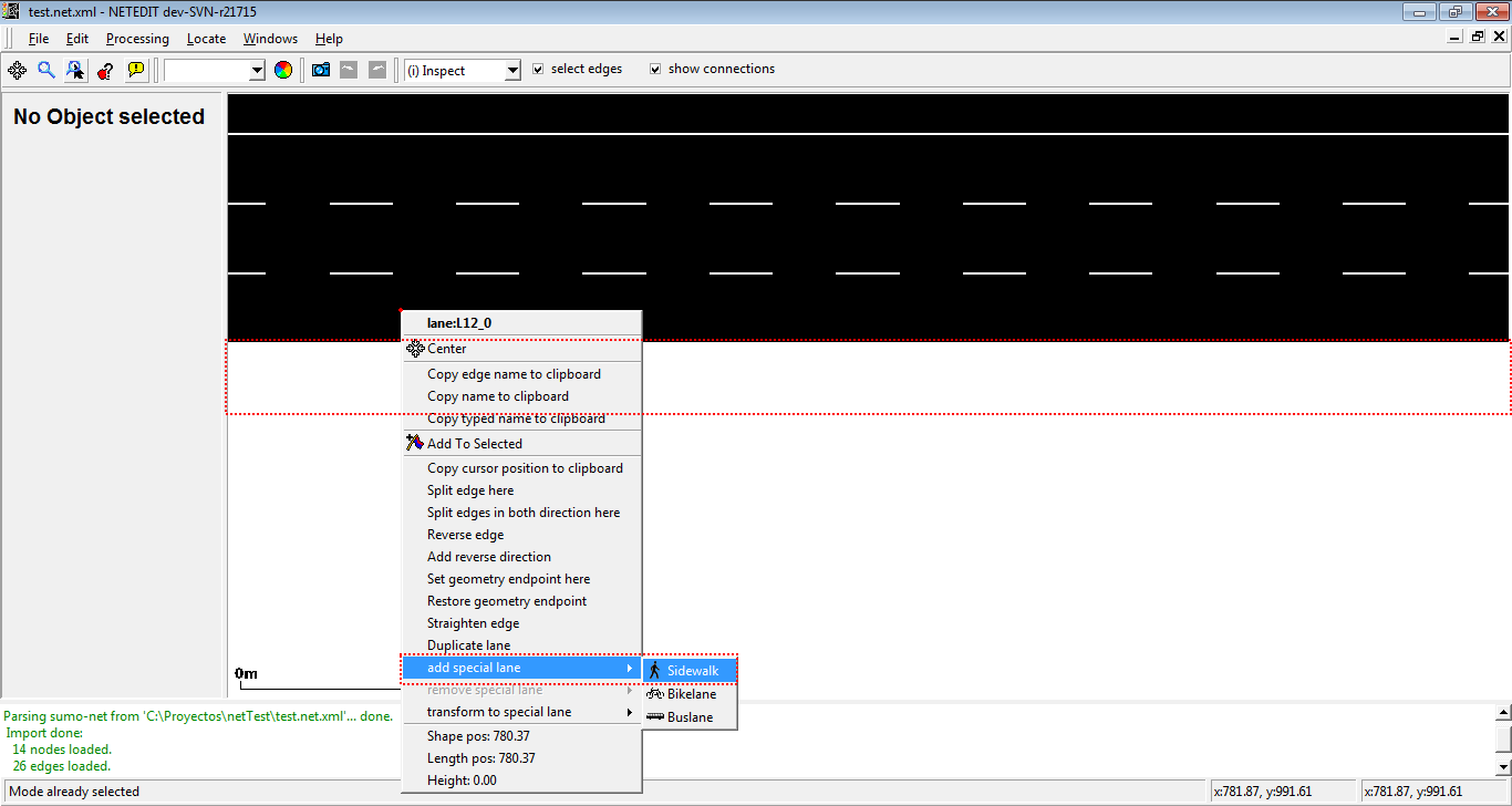 Restricted lanes for particulars vehicle class (VClass) can be easily added in inspect mode. Currently netedit supports sidewalks (where only vehicles with VClass="pedestrian" are allowed), bike lanes (where only vehicles with VClass="bike" are allowed), and bus lanes (where only vehicle with VClass="bus" are allowed). Note that only one type of restricted lane is allowed in every edge (For example, an edge can own two restricted lane, one for buses and another for bikes, but not two or more different restricted lanes for buses.