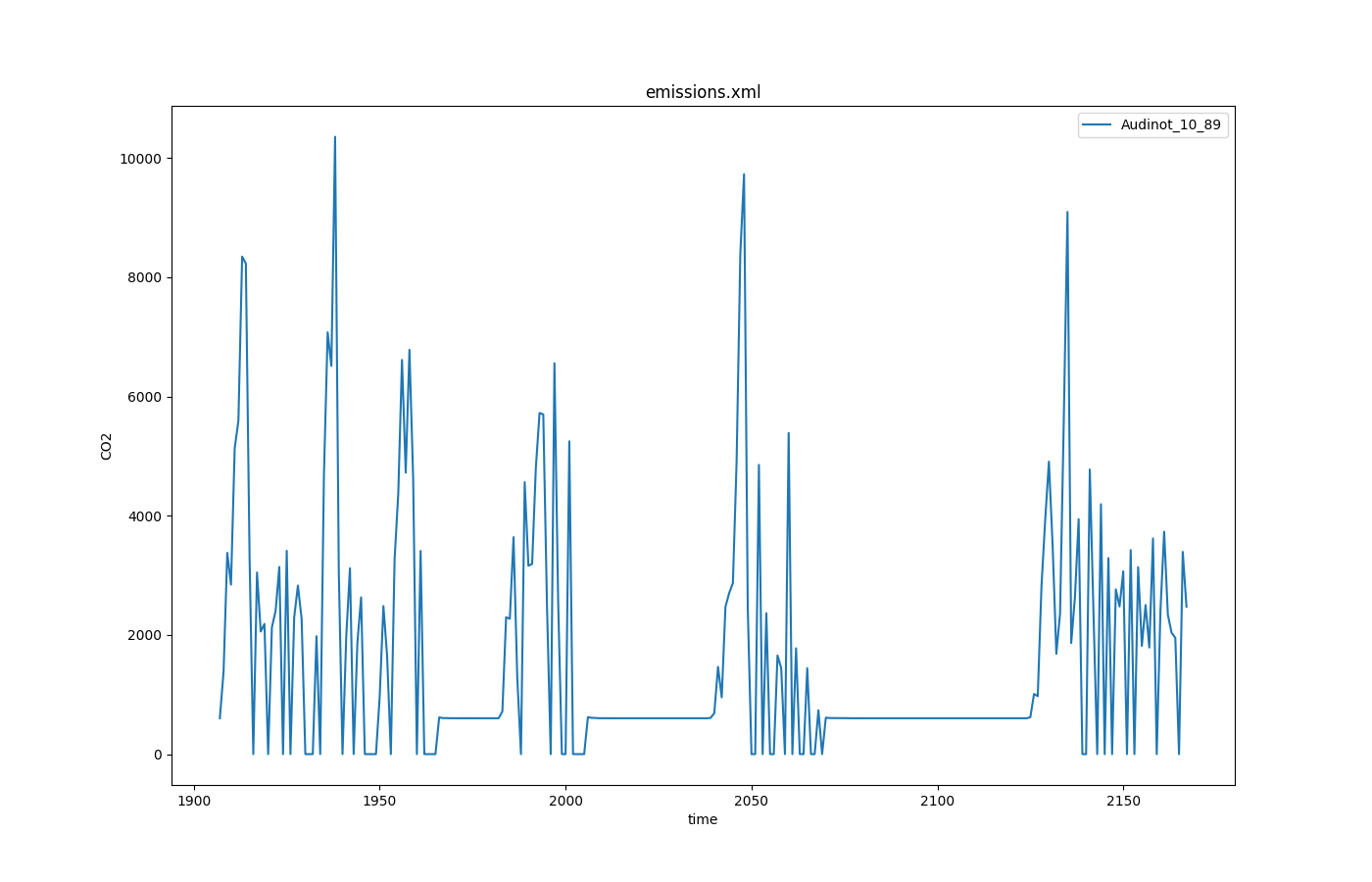 python plotXMLAttributes.py -x time -y CO2 -s -o CO2_output.png emissions.xml -i id --filter-ids Audinot_10_89 --legend