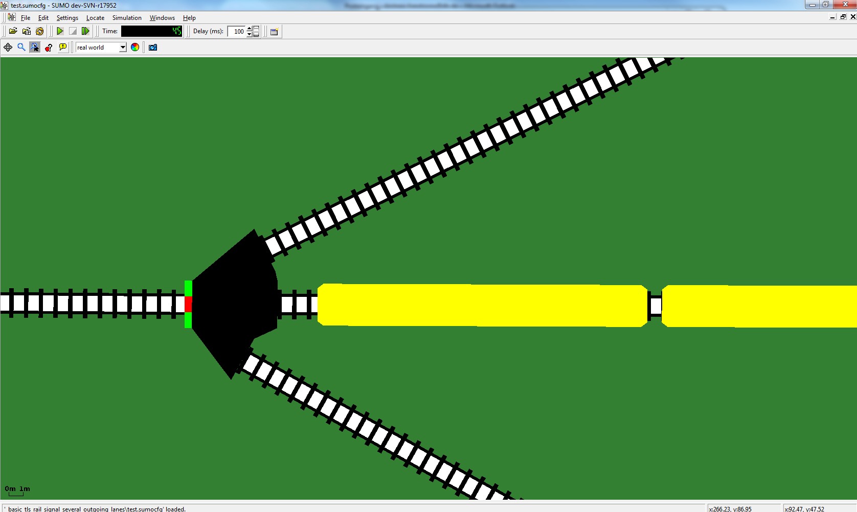 - If several trains approach the same junction/railroad switch from different lanes/edges and want to enter the same lane, at most one of these trains gets a green signal and all other trains get a red signal, even before one of these trains has entered the targeted lane. This will avoid that trains approach a rail signal with high velocity and receive suddenly a red signal without having enough space to break before the rail signal.