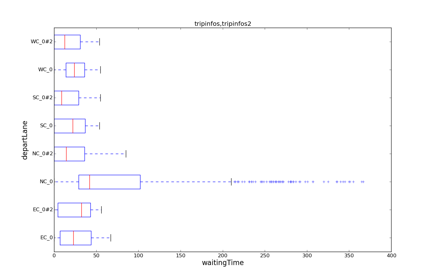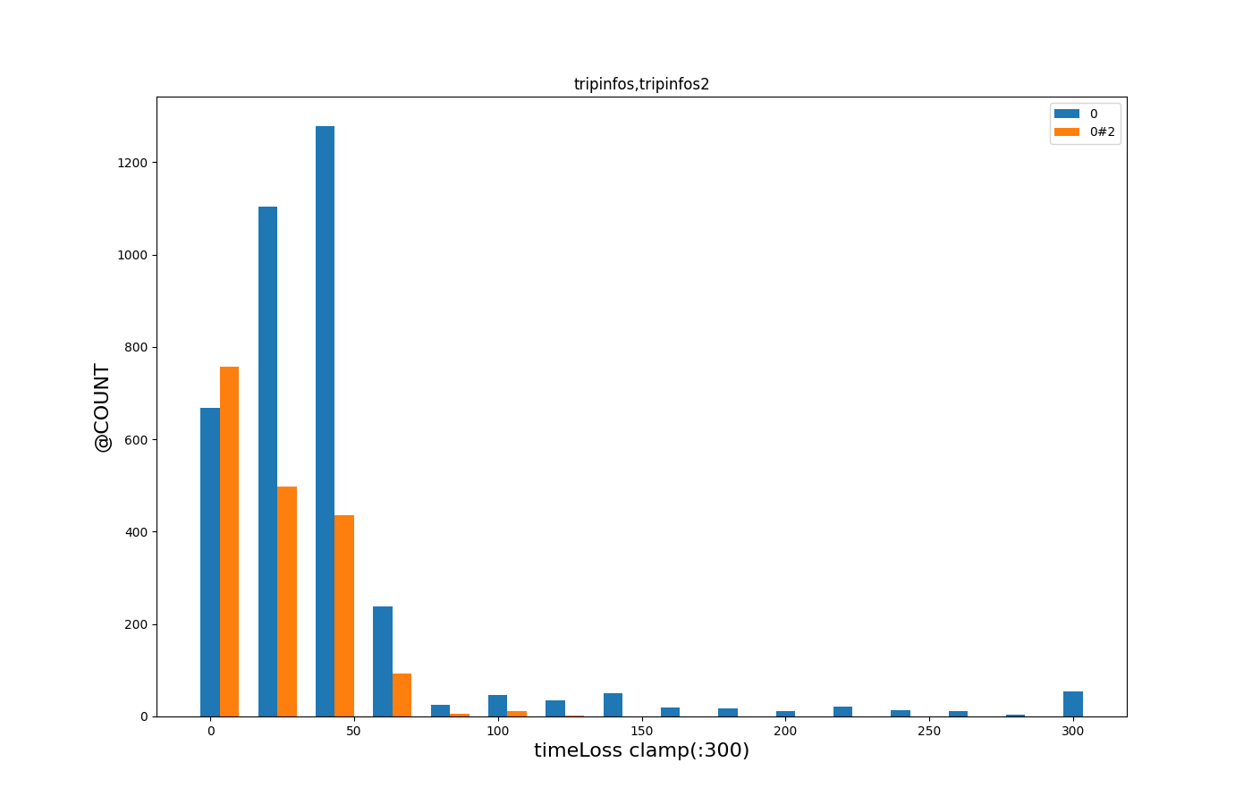 Reads two tripinfos files (mandatory options --tripinfos1 <FILE> and --tripinfos2 <FILE>, or, for short -1 <FILE> and -2 <FILE>). Extracts the value described by --value (default: duration). Plots the values of tripinfos2 over the according (same vehicle) values from tripinfos1.