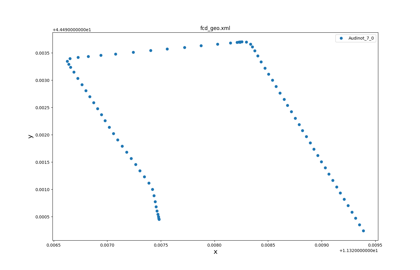 python tools/visualization/plotXMLAttributes.py -x x -y y -o vehLocations_output.png fcd.xml -i id --filter-ids Audinot_7_0 --scatterplot --legend