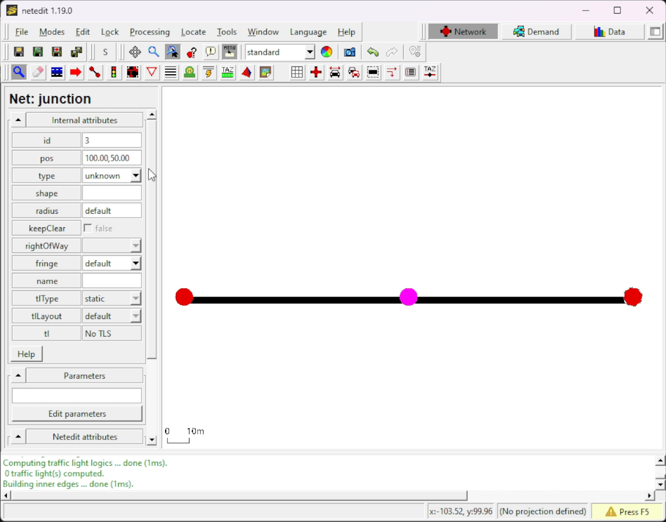 Now we want to rename our recently inserted Junctions and Edges (which get arbitrary id's when created) and also make our simple network prettier, by aligning all nodes.