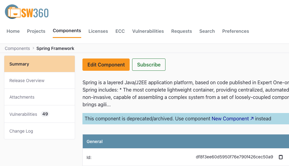 Depending on how Admins are using the SW360 instance, they want to manage the Component naming/grouping in a different way. There can also be scenarios where an OSS project decided to rename themselves over period. In such cases, you might want to mark a Component as deprecated and provide an alternative to be used instead.