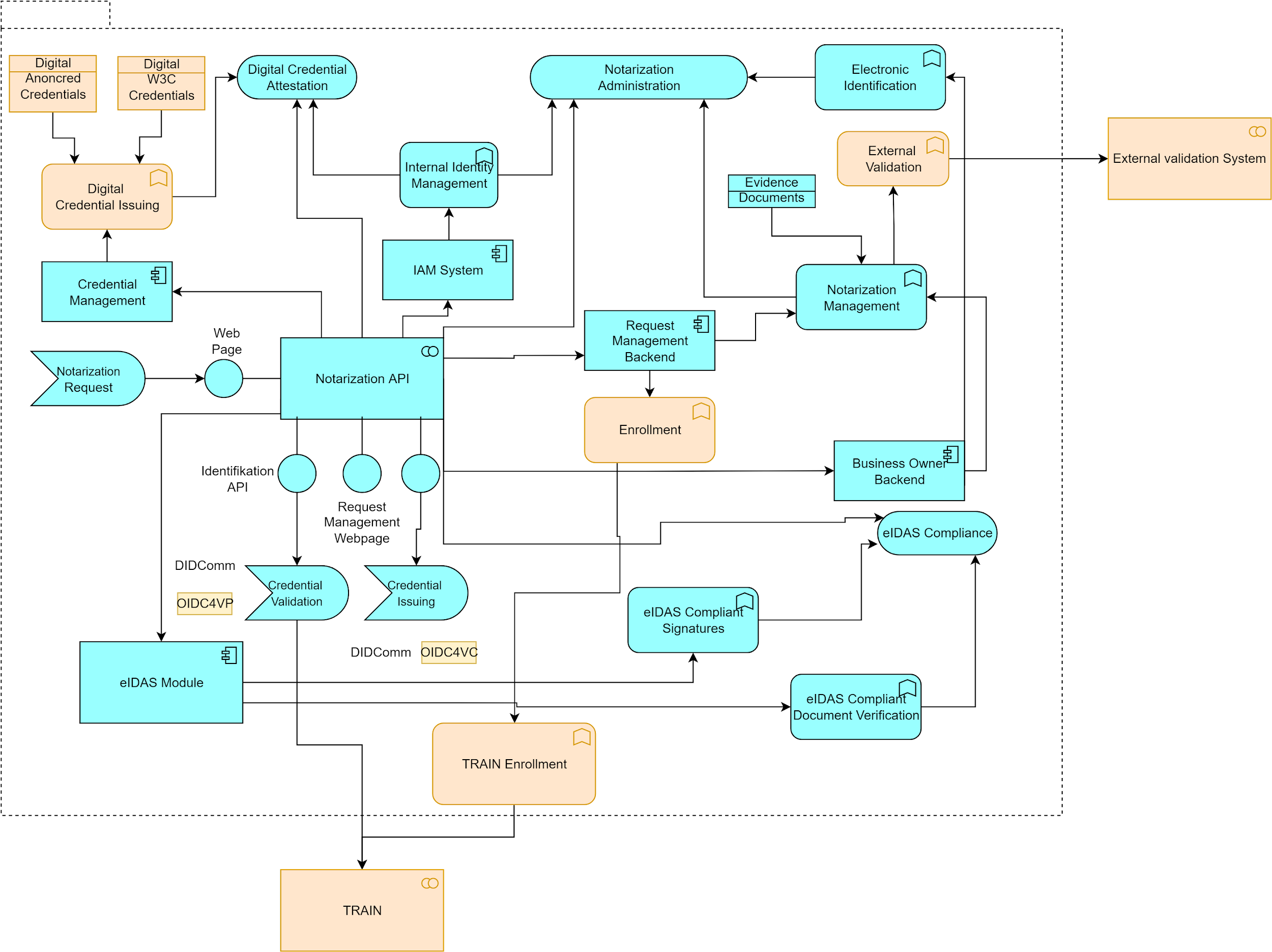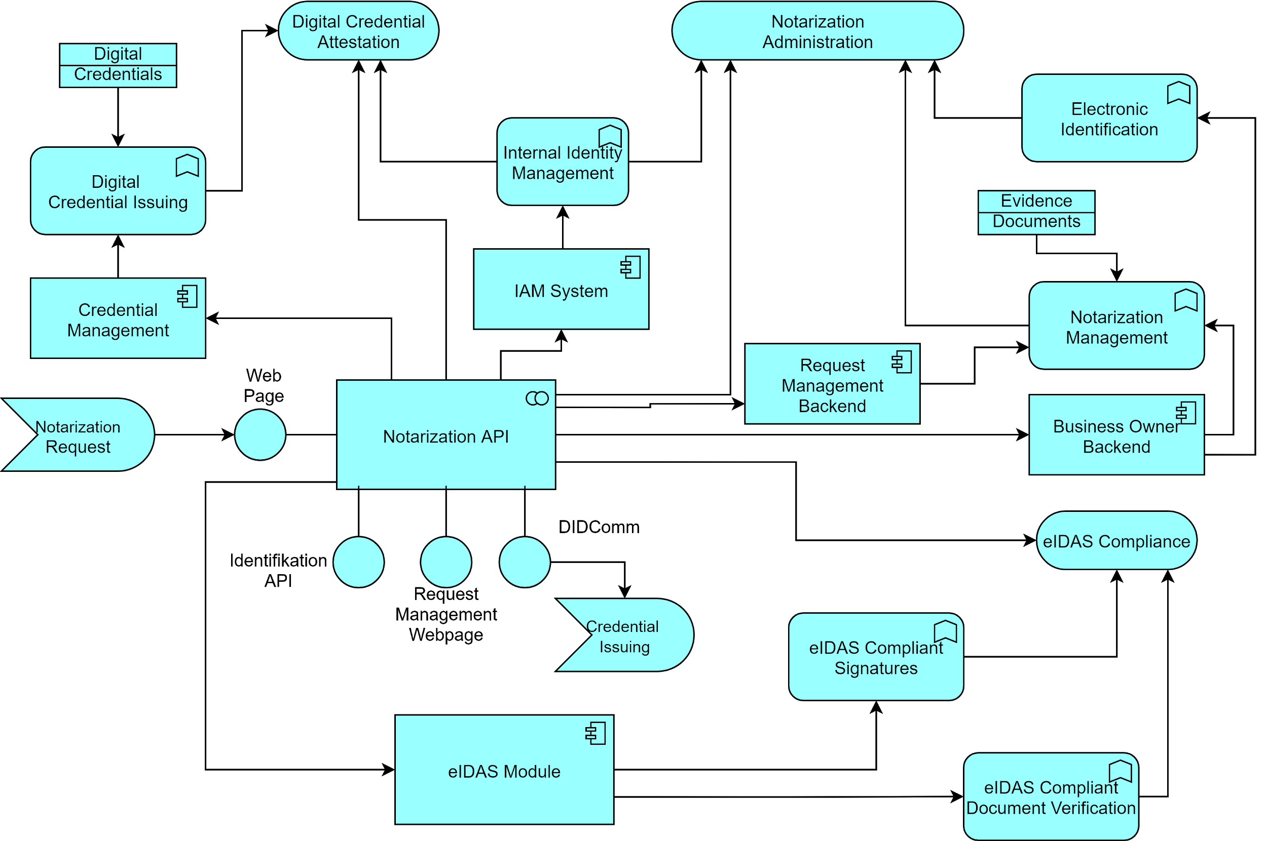 The product extension must include interfaces (API's) to integrate the notarization component smoothly in external software for Non-IT operator usage (e.g., lawyers, notaries, governments, certifiers ...). If it's required to do code restructurings, modifying the current solution by adding new microservices etc. then this is explicitly allowed. Please note, that it is explicitly required to deliver the software up and running. Responsibility for existing code cannot be shifted to previous development teams.
